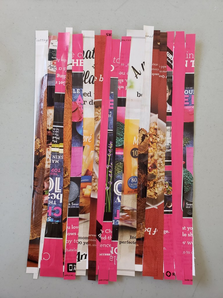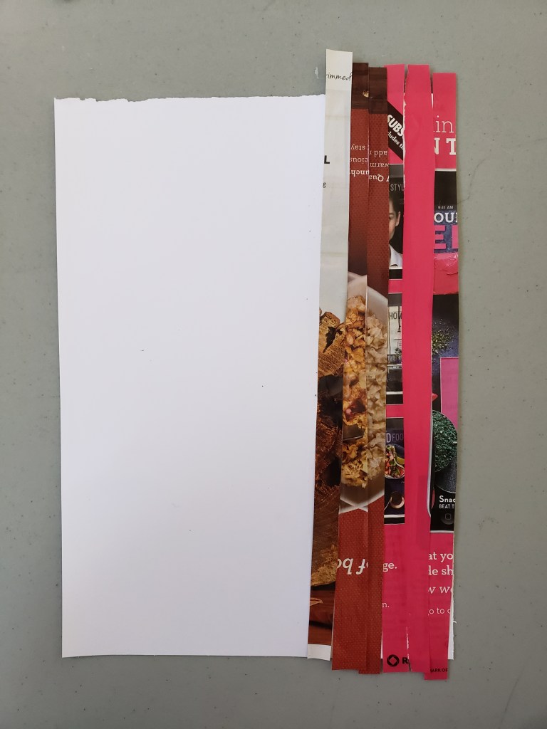 - Cut 2 or 3 magazine pages into strips (make sure to pick colourful ones)