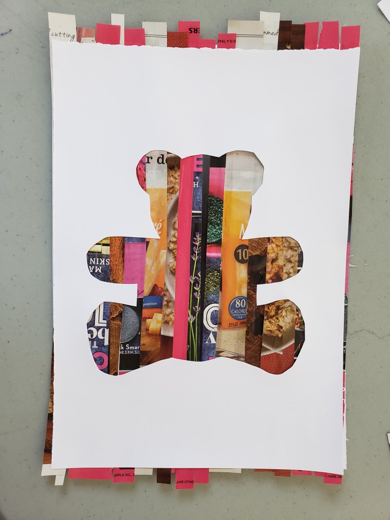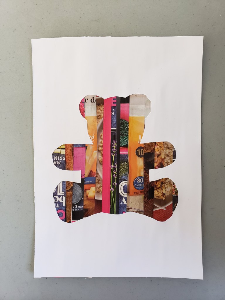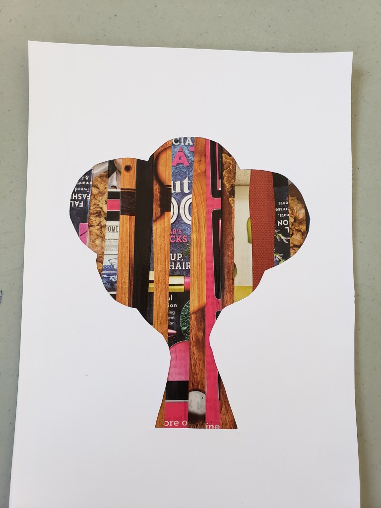 - Glue your page with the cut out shape on top of the magazine covered page. Make sure to push down the edges. Put something heavy on it if it starts to curl up