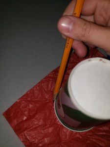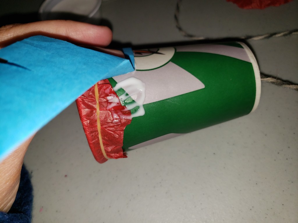 5. Glue the strip of tissue paper around the cup adding glue as you circle the cup. Cut off the excess. Start near the elastic and work you way up.
