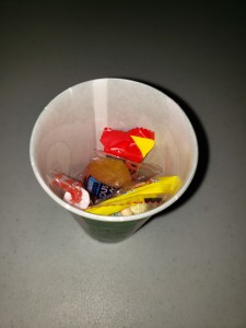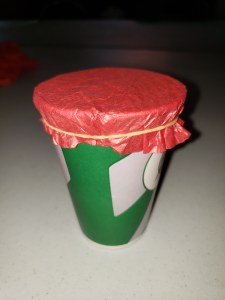3. Add the candy to the cup then secure the circle of tissue paper with the elastic to the cup. Since Halloween is right around the corner stores are filled with mini candies, especially mini chocolate bars. 🙂 Alternately, if you do not have an elastic you can glue the tissue paper to the bottom of the cup, just make sure to let it dry before you complete the next steps.