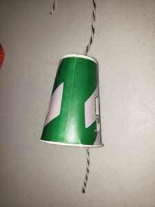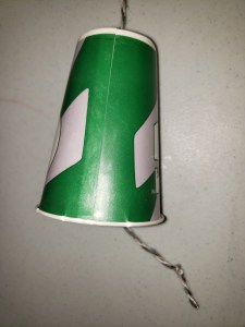 1.Poke a hole in the bottom of the cup, pull the 30 cm string through the hole and tie a knot.