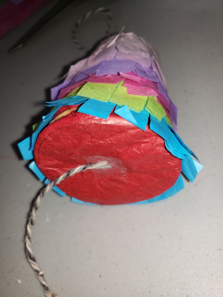 7. Tape the other piece of string to the bottom of the piñata onto the tissue paper. When you need a little celebration pull the bottom string and watch the candy fall.