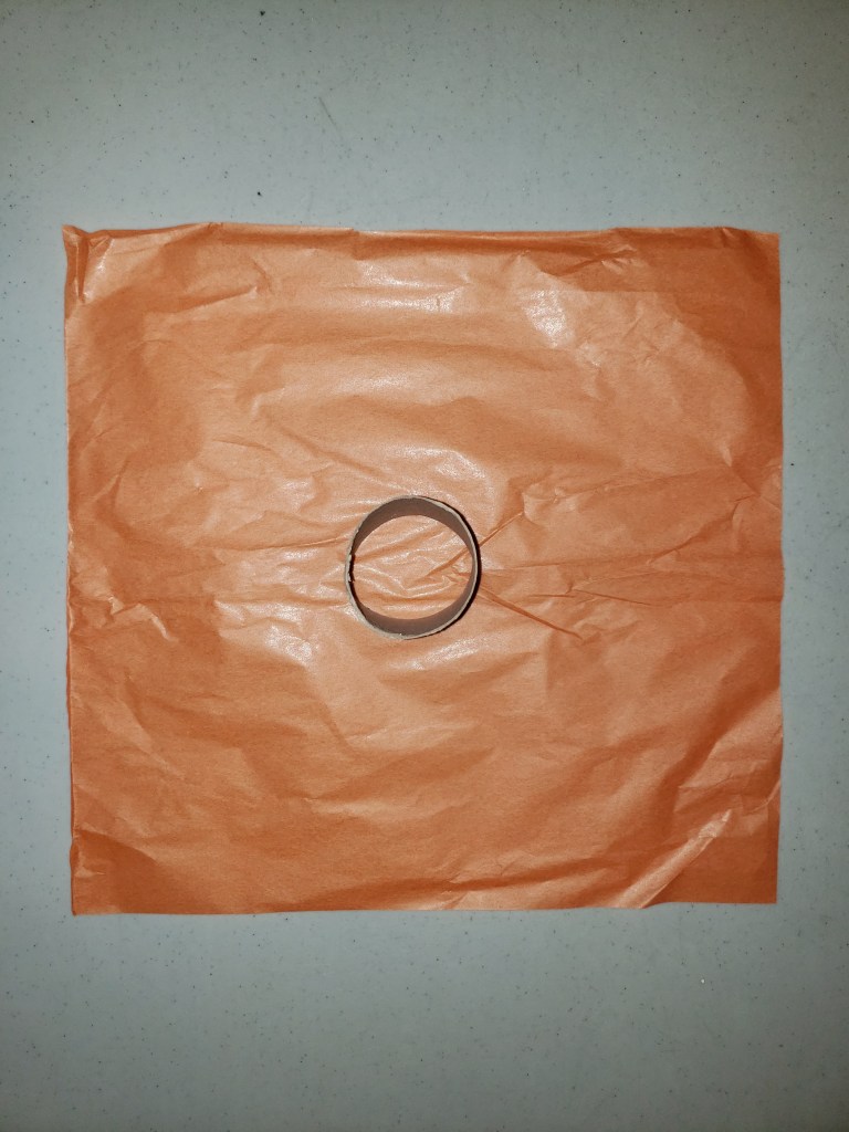 2. For Pumpkins cut a 10″ (25cm) square piece of tissue paper. Place the toilet paper roll half in the centre of the square tissue paper piece. Fold each corner up to the centre of the paper roll then twist the excess to make a stem.