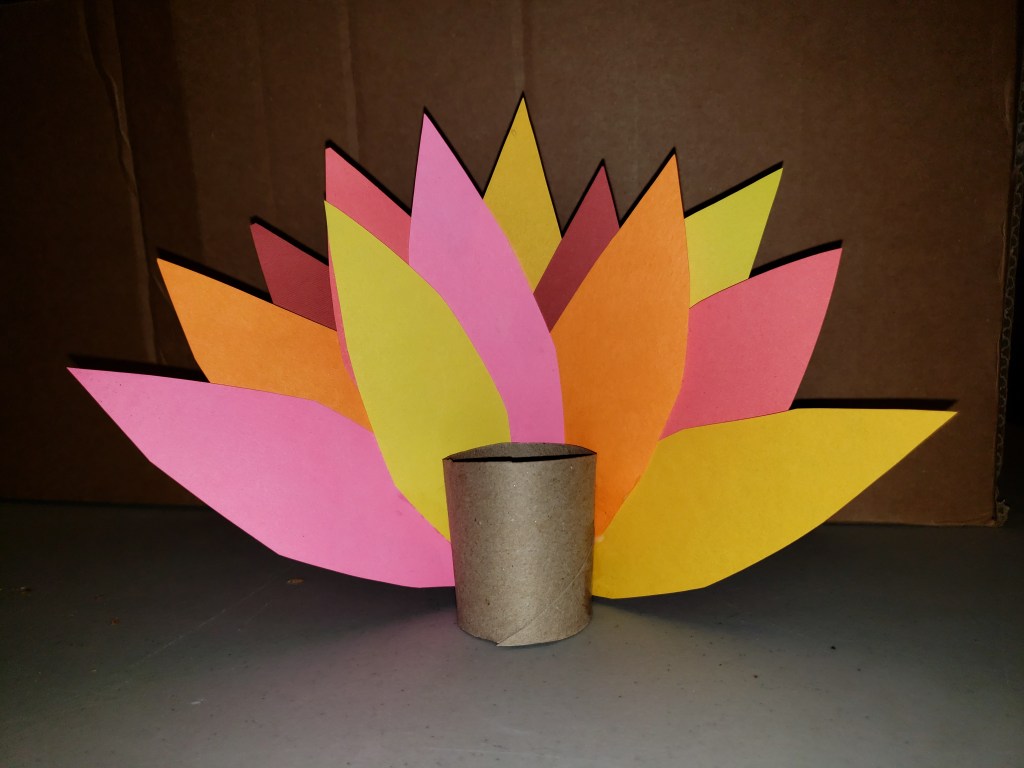 5. Glue the feathers to the back of the last toilet paper roll. The turkey needs at least 3 feathers but you can add as many as you think they need. The more you add the more fuller the turkey’s tail feathers will look. Let dry.
