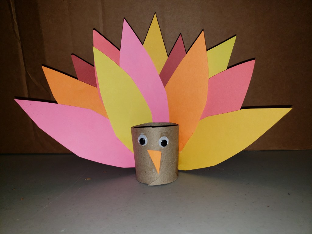 6. Cut a small triangle out of orange paper, that’s the beak, then glue it as well as the googly eyes to the front of the turkey to complete your bird.