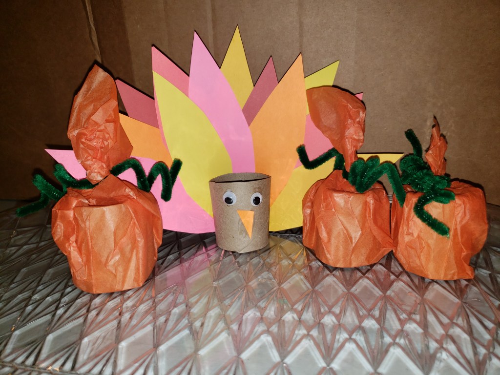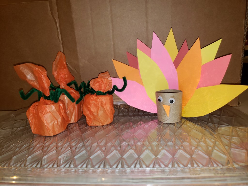 - Cut the Toilet Paper rolls in half – 3 will be pumpkins, 1 will be a Turkey