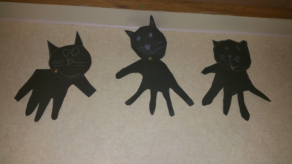 Trace your hand onto the black paper and cut it out. For the head you can either just draw a circle with cat ears or trace a cup or bowl then add the ears to the top and cut out. Draw your cat face and either attach it to the palm part of the cut out hand with the paper fastener or just glue it in its spot.