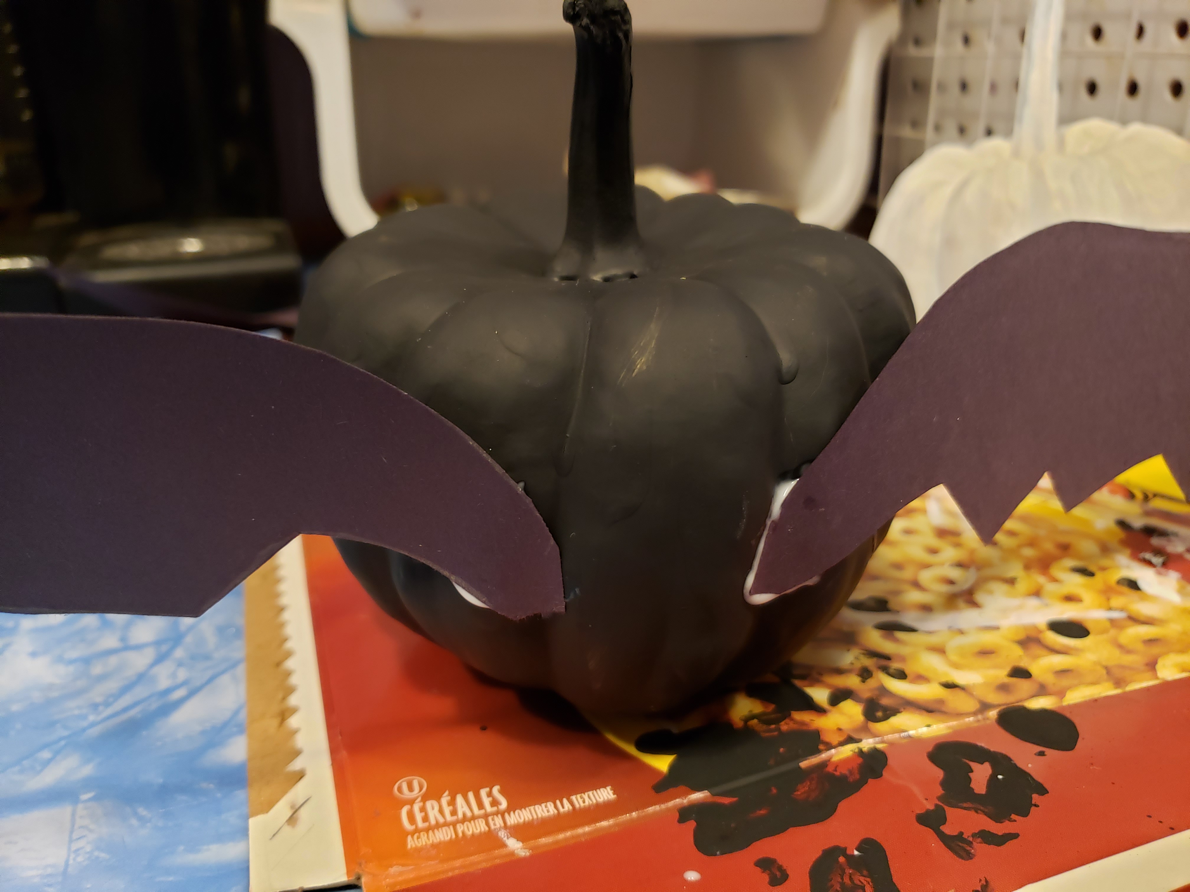 Fold your black paper in half and draw wings. Cut them out, and glue them to the back of your black pumpkin. You will have to hold them in place for a bit till the glue sets.