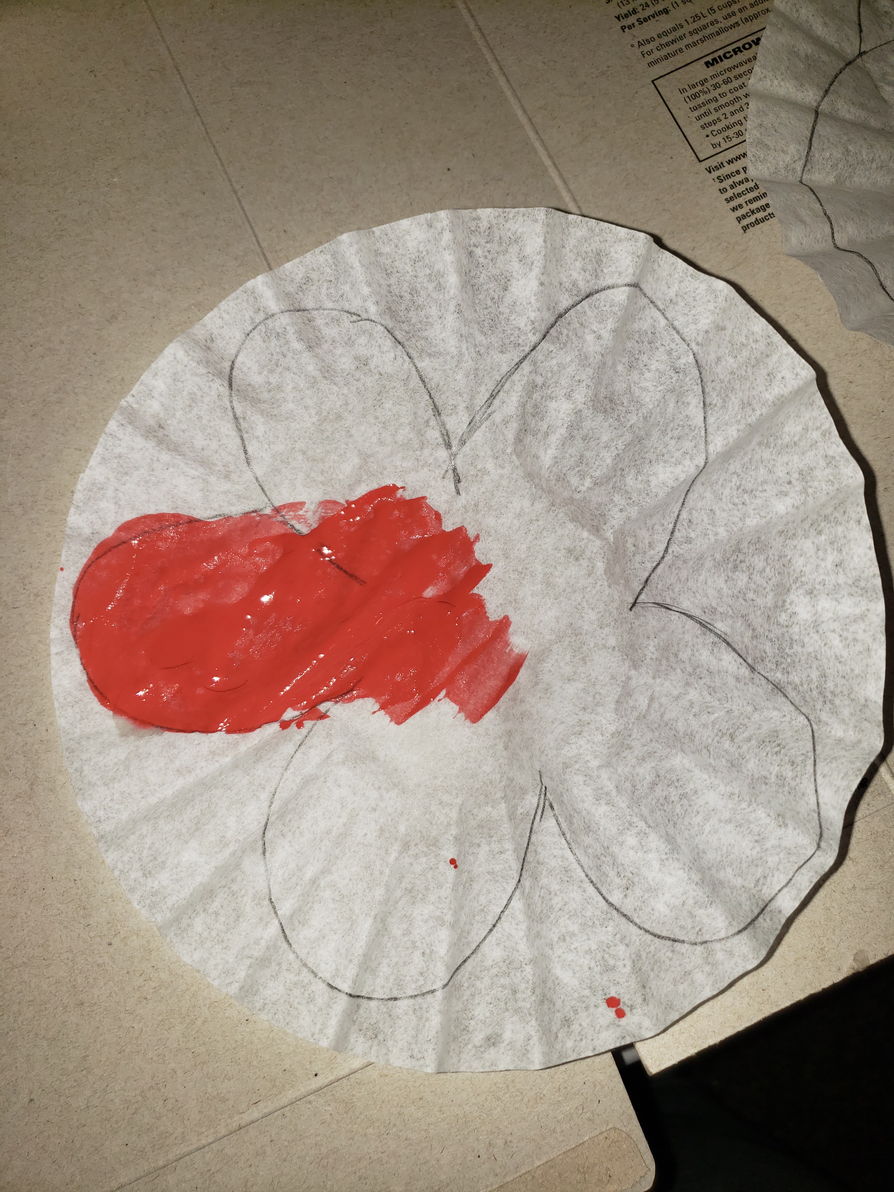 Add a little bit of water to the red paint and mix it all thoroughly, this is to thin out the paint. Paint your poppies red. Make sure to cover your workstation with newspaper or a piece of cardboard as the paint will leak through the coffee filter.