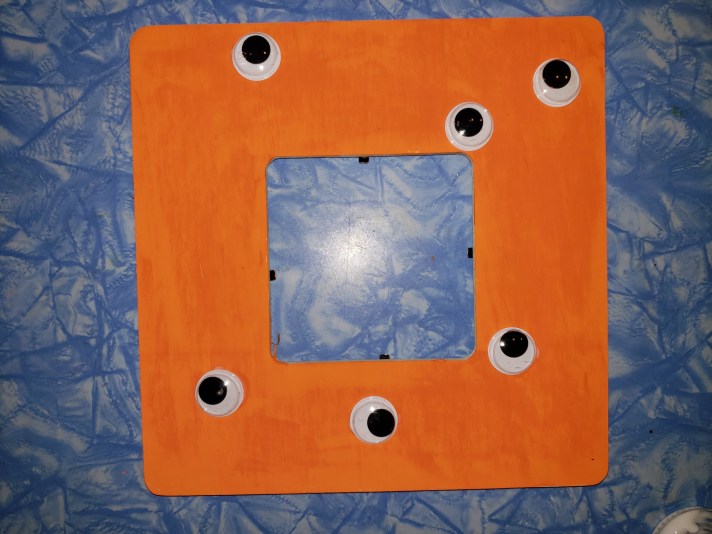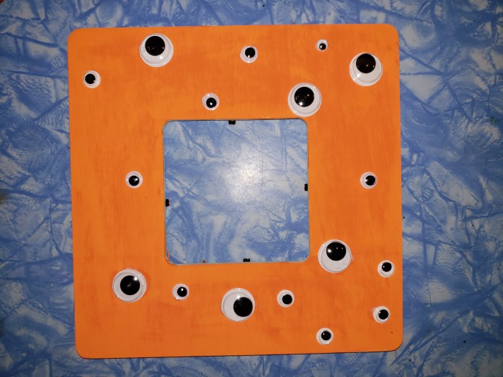 - Then the fun begins, start gluing on your googly eyes, EVERYWHERE.