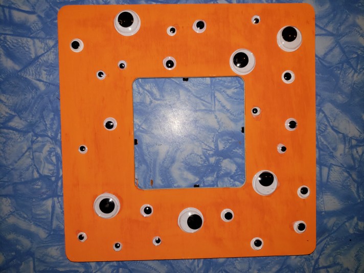 - We like to start with the biggest ones first then the next biggest, then the next and so on and so forth until you have either run out of space or eyeballs to glue. Make sure to use enough glue so that the eyes will set and not fall off when you hang you frame up.