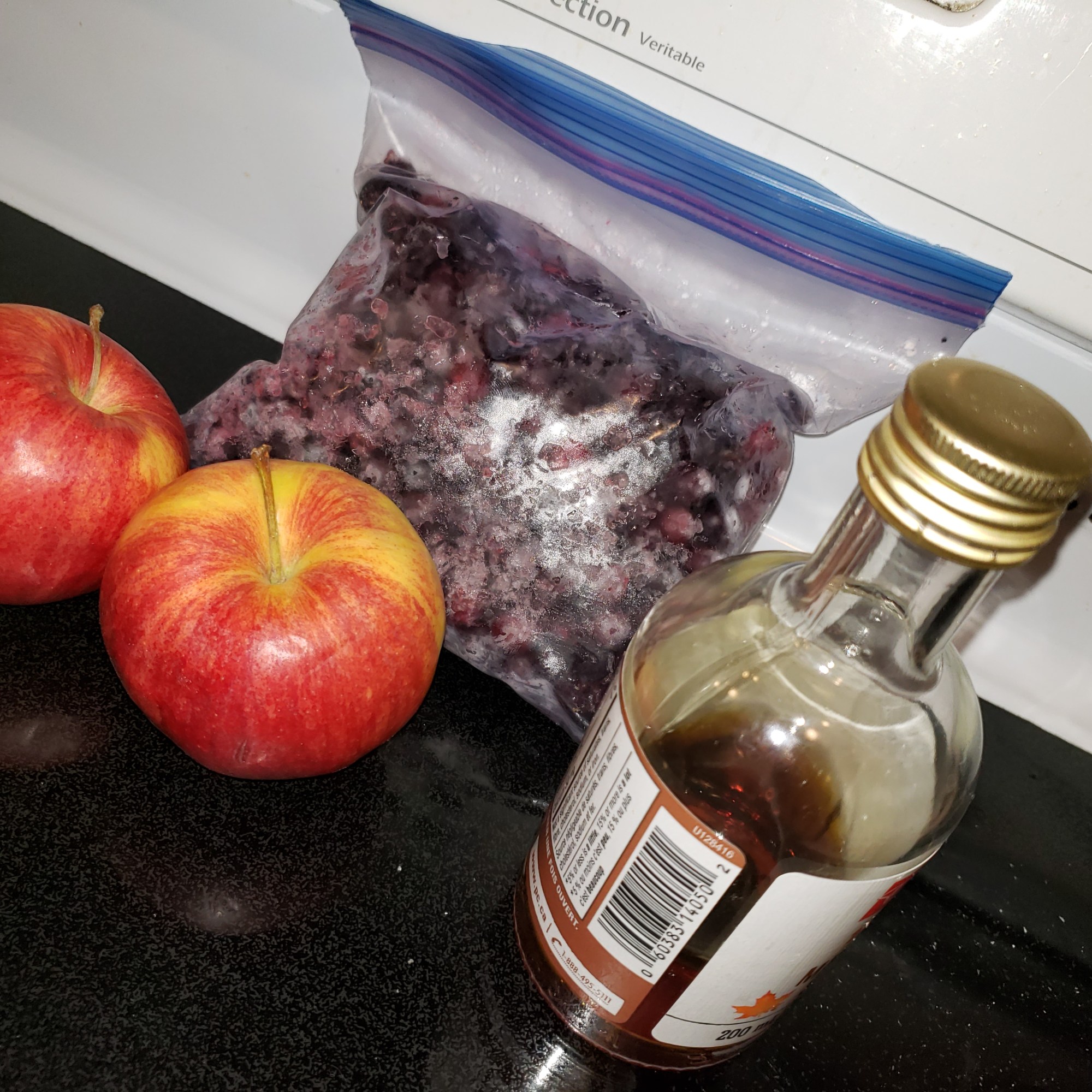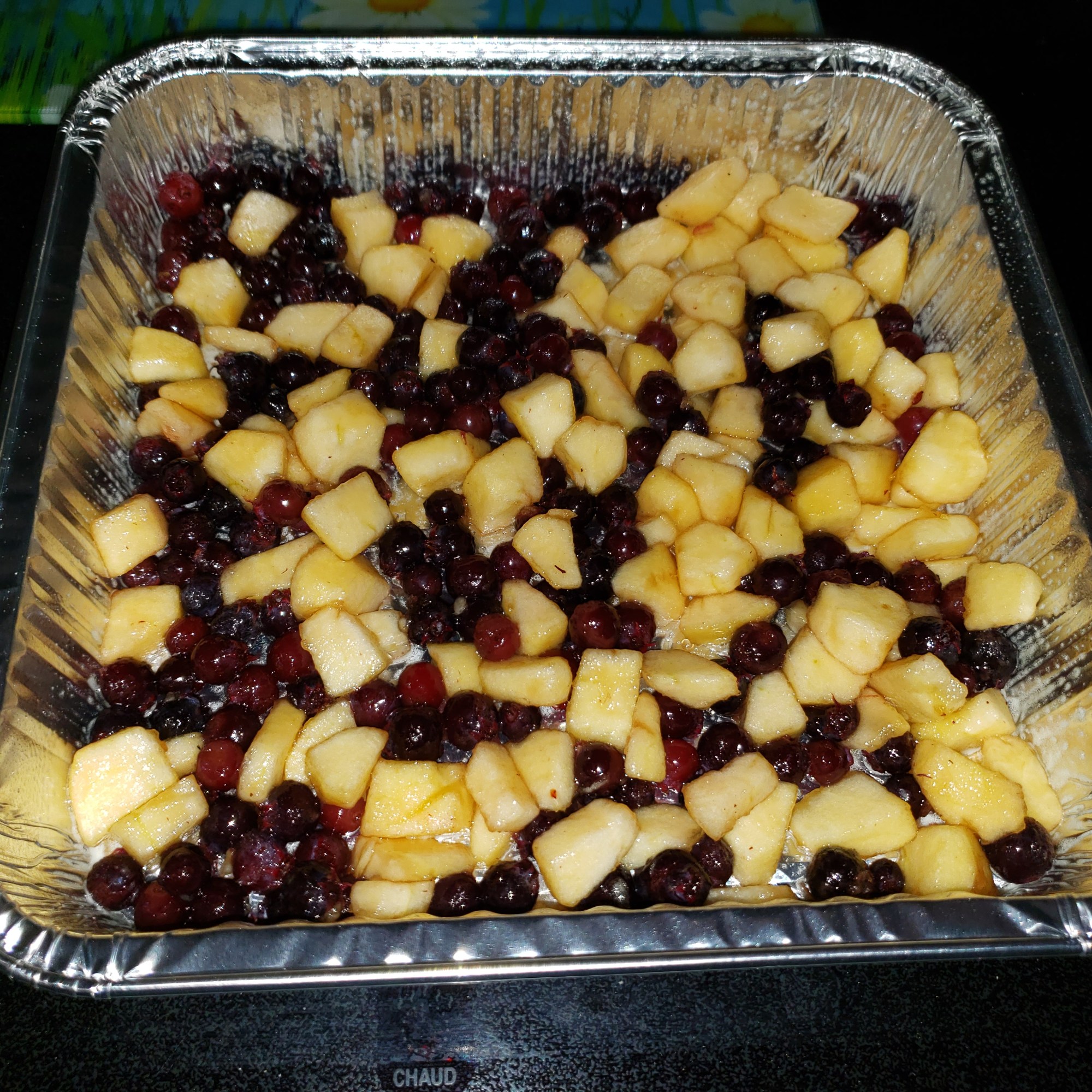 - Peel and core the apples, cutting them into small bite size pieces, place in a bowl. Add the Brown sugar, mix together. Next add the berries to the apples then you guessed it mix again.