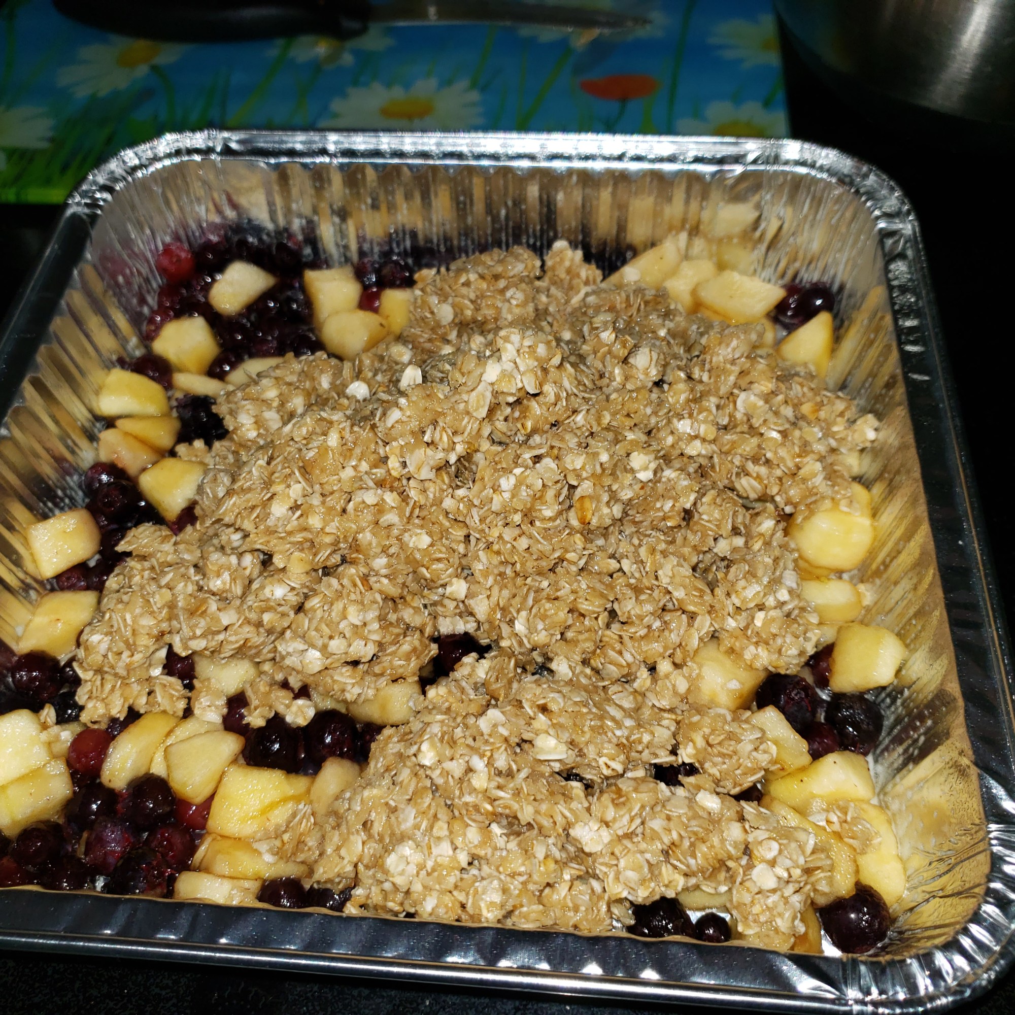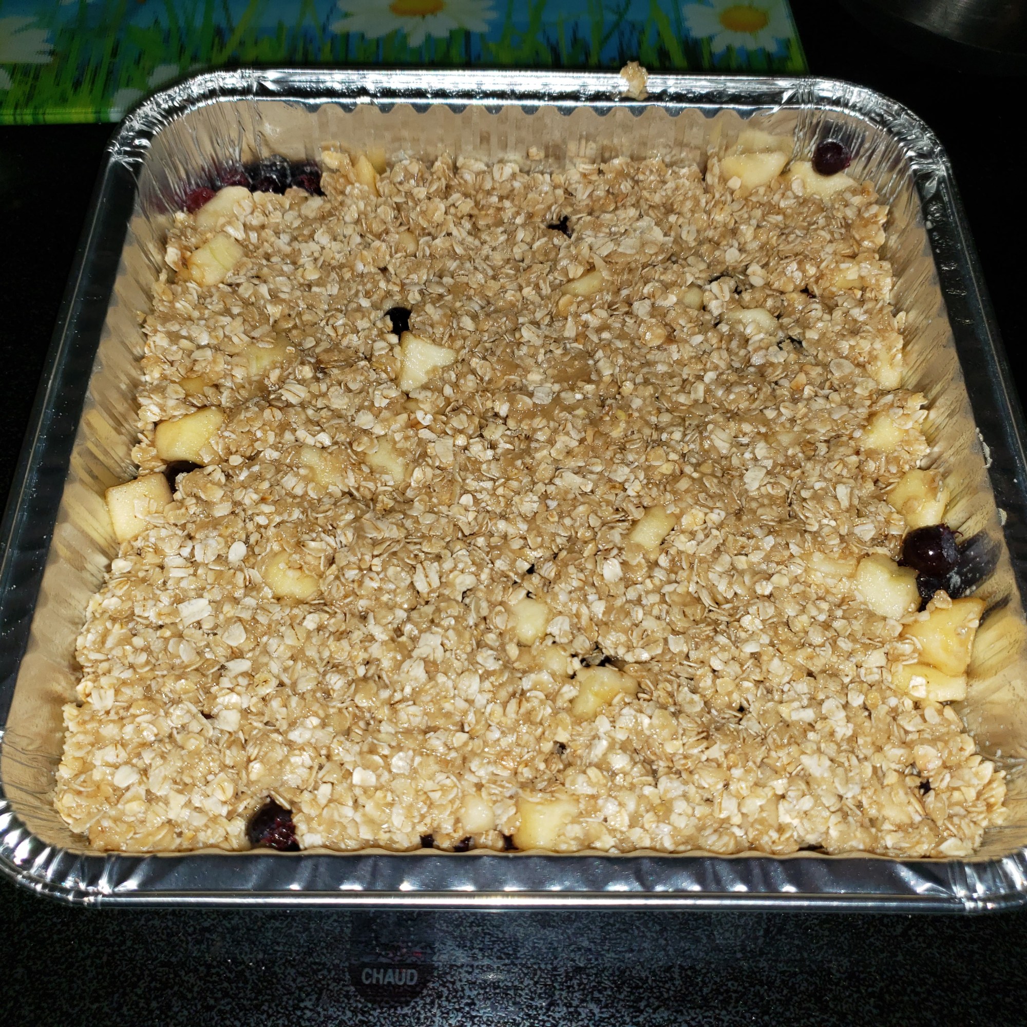 - Spread the fruit in the bottom of the pan, then spread the oat mixture on top of the fruit.