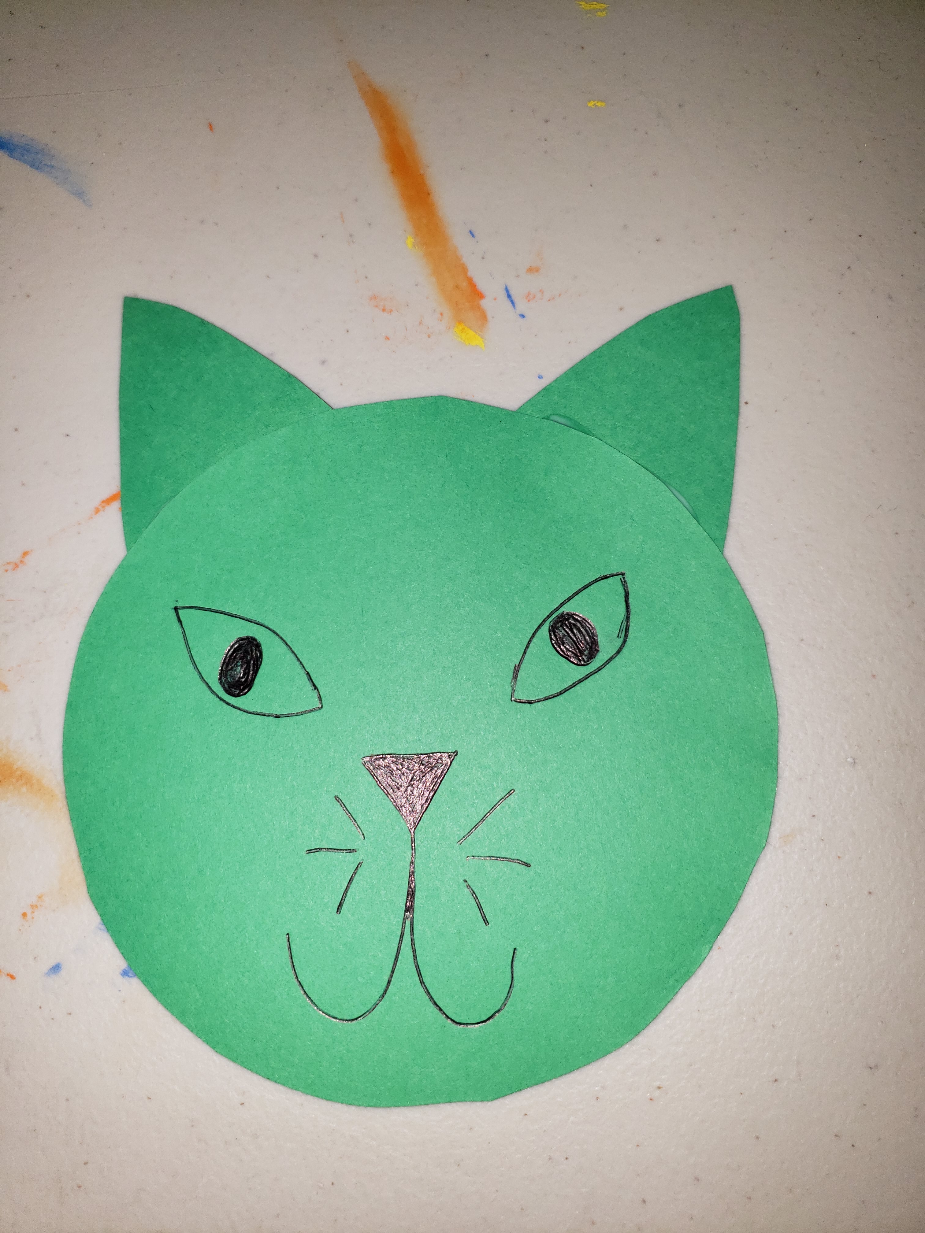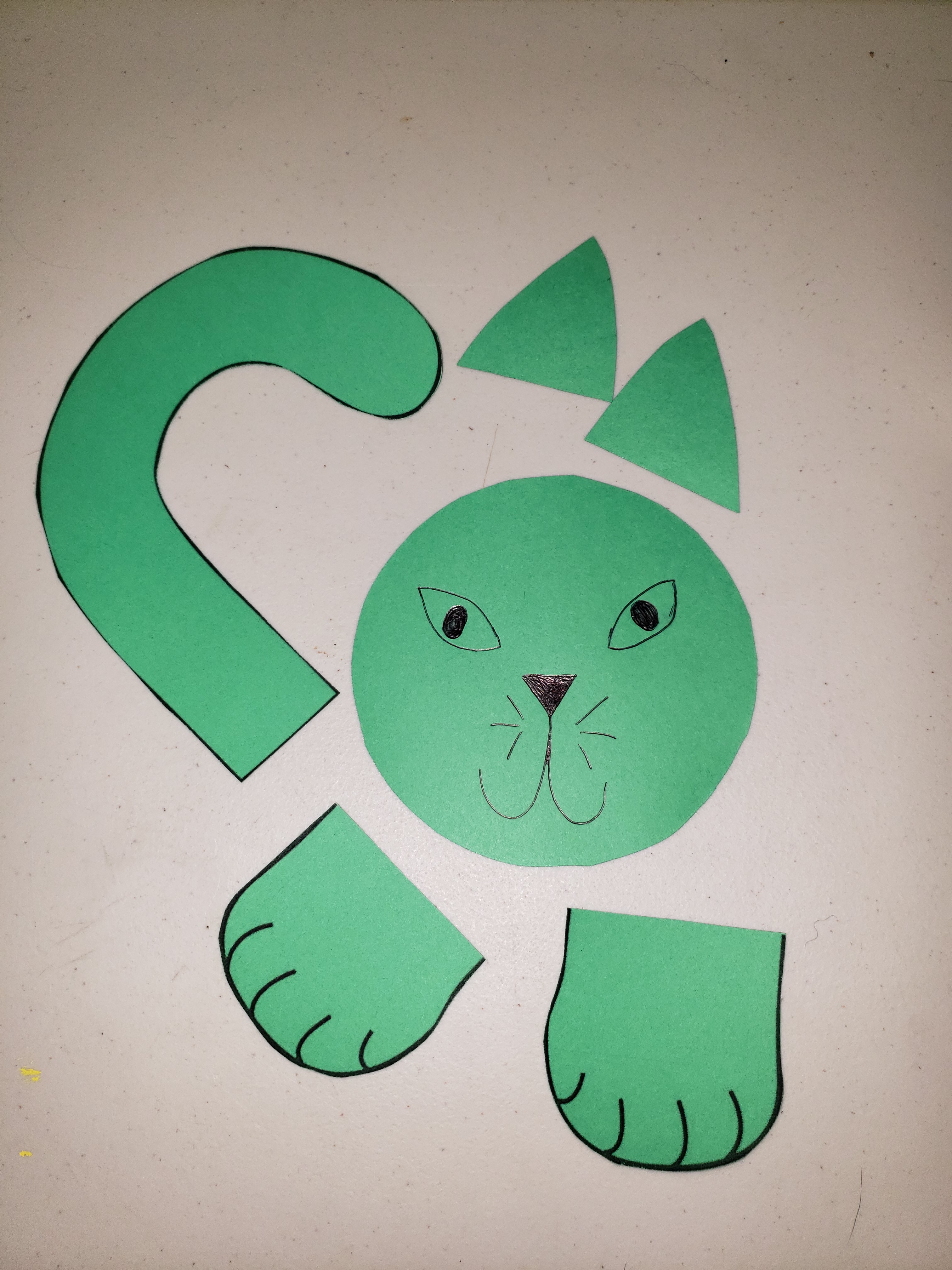 Print the cat body parts PDF onto the cardstock and Cut them out. Next draw a cat face onto the head (the circle). If you don’t have cardstock plain paper works well too. Also white cardstock for the body parts is also a good substitute as then you can ass more colour to this cool cat.