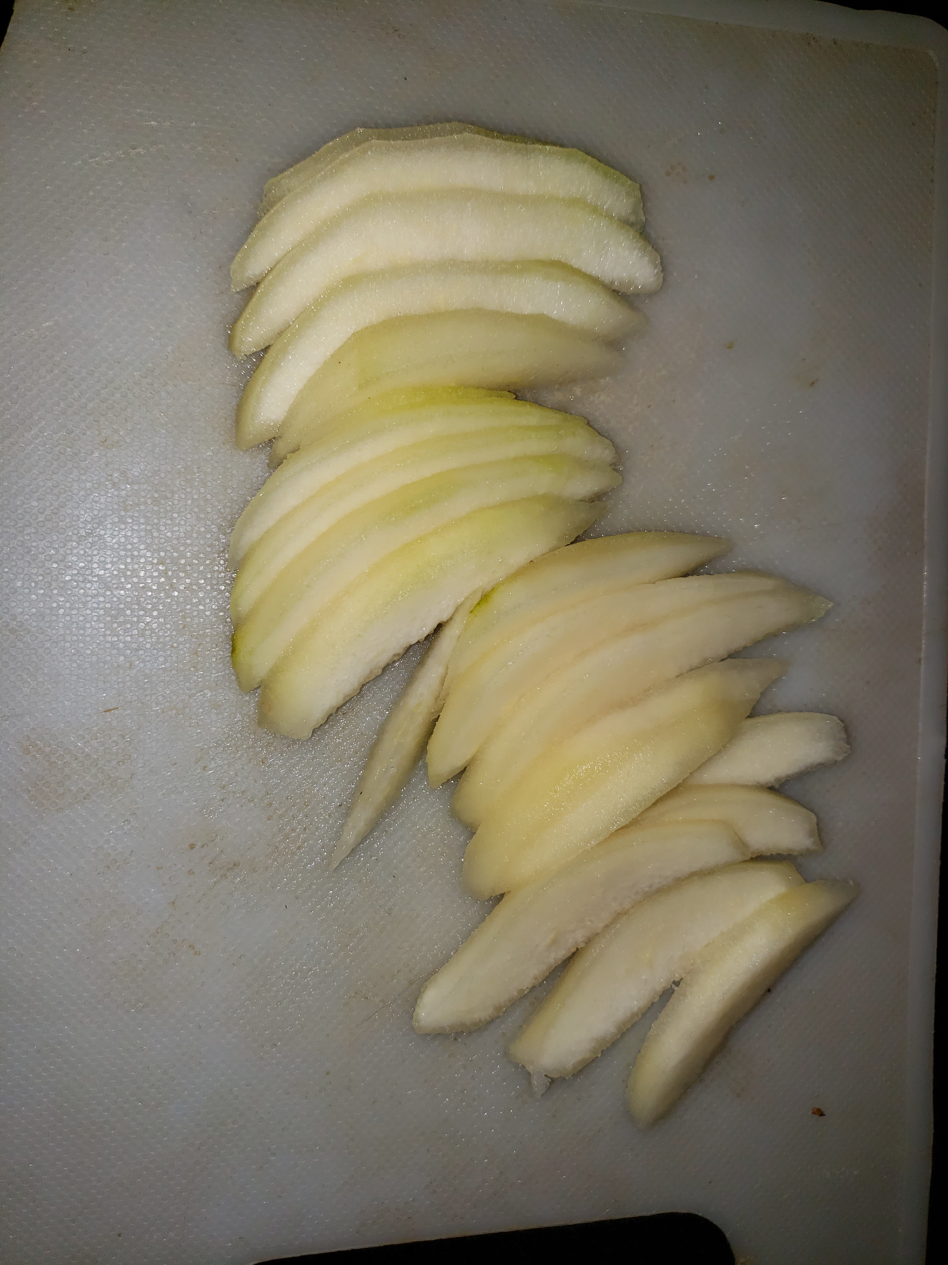 4. Peel and cut one pear into small pieces, fold those pieces into the cake batter. Cut the second pear into slices, set aside.