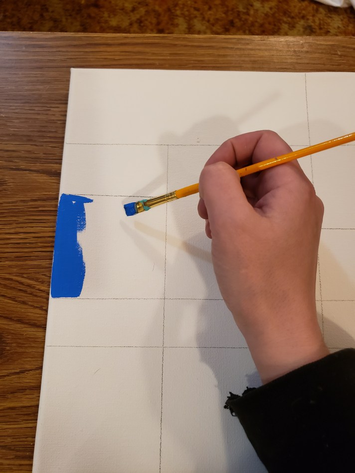 Paint in the squares, a solid colour for each square. If your canvas is not white don’t forget to include white in your squares as well. If you are using a white canvas then leave a few squares blank to create a contrast between the colours and the background. Let dry before you complete the next step.