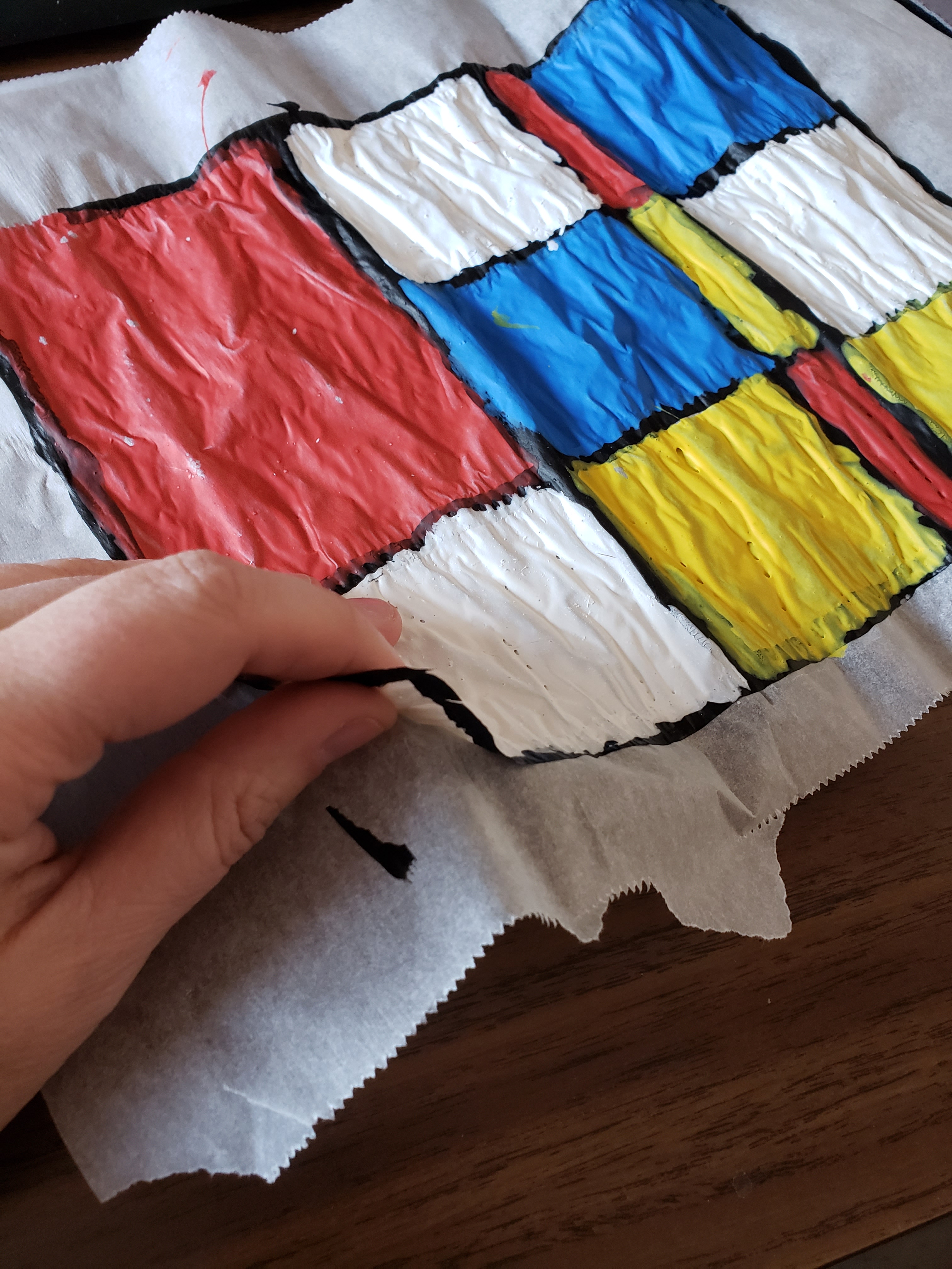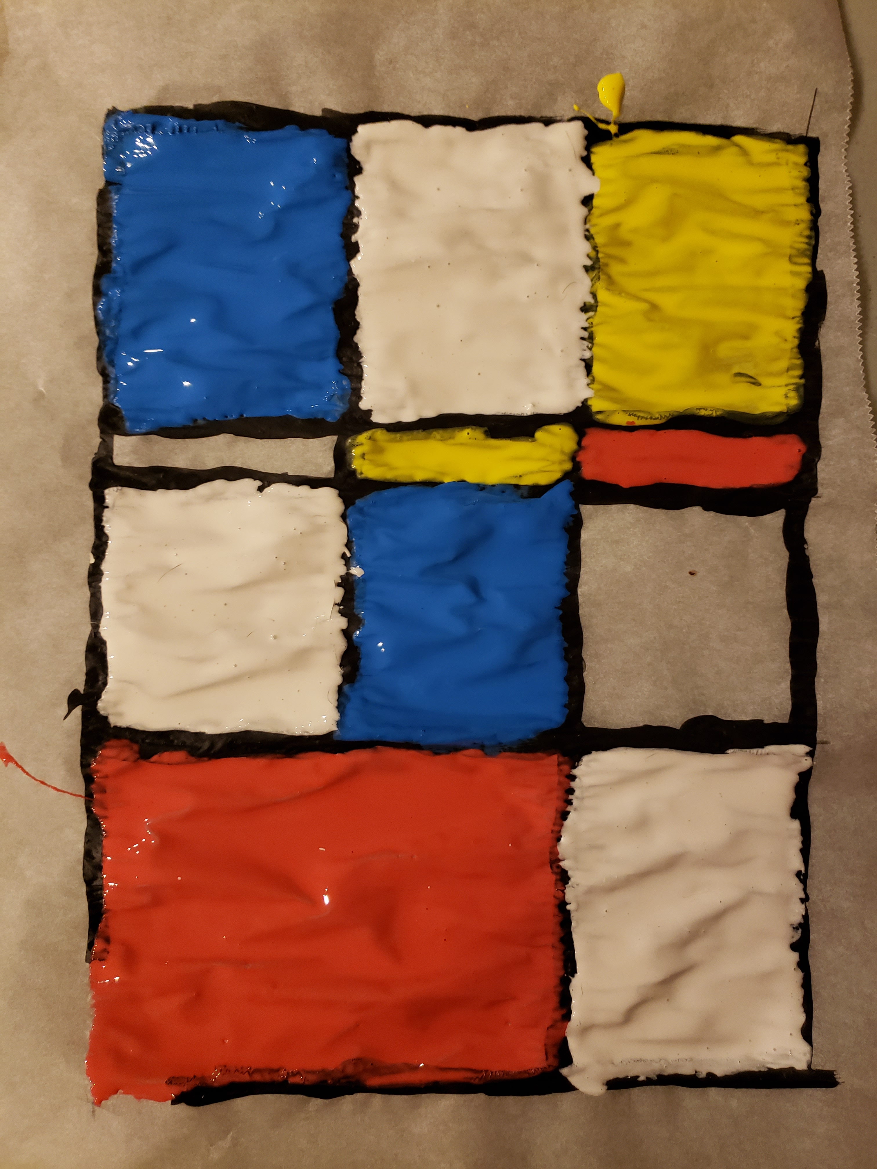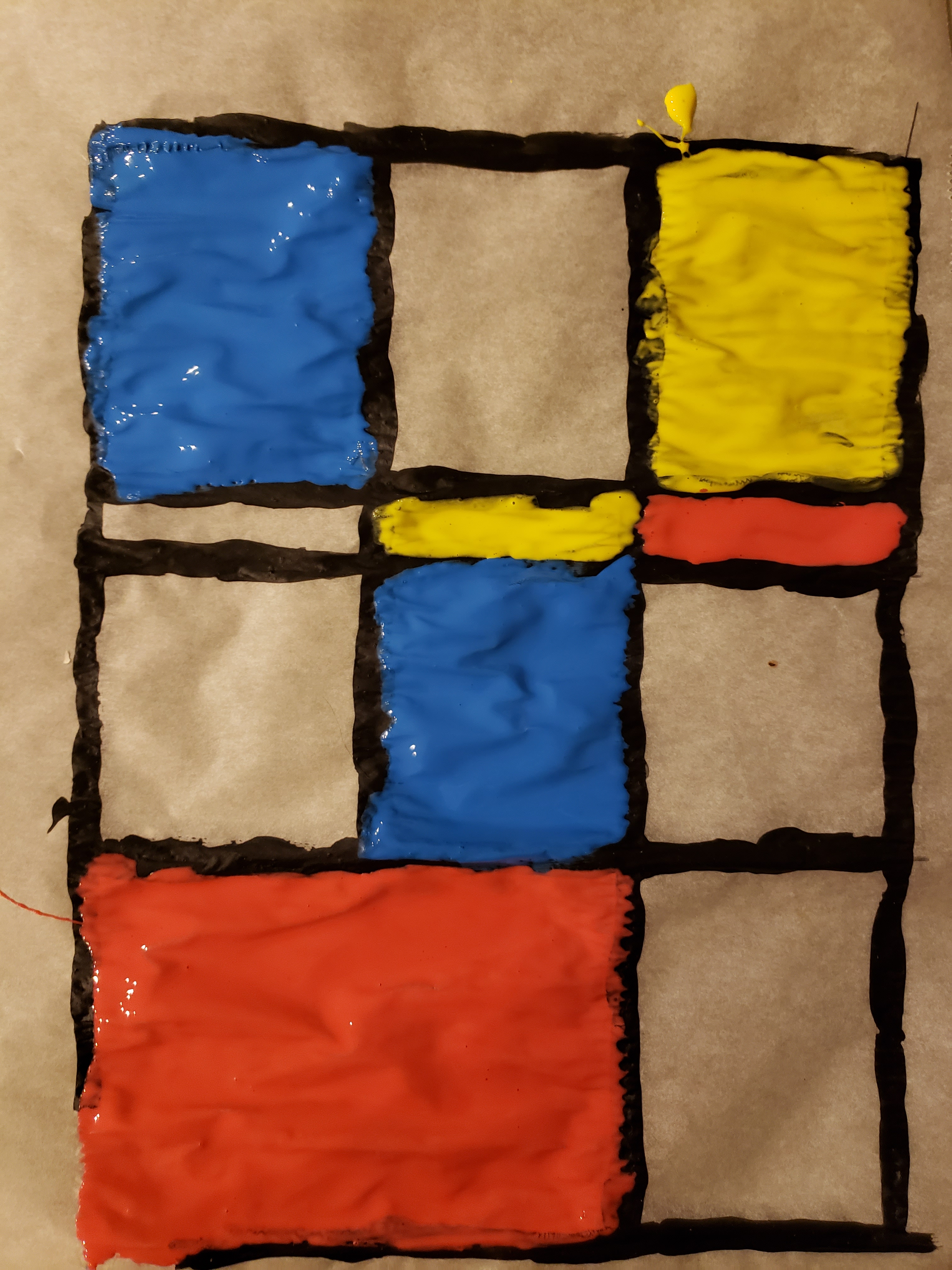 Once dry paint each square a different colour. Mondrian only used primary colours so the window paint you mix should be red, yellow, blue, white and black. Making sure to paint a little on the black edges so there are no holes in your sun catcher. (I lost a bit of the edge as I had to move tables so be careful if moving and make sure you use a thick layer for the black outline)