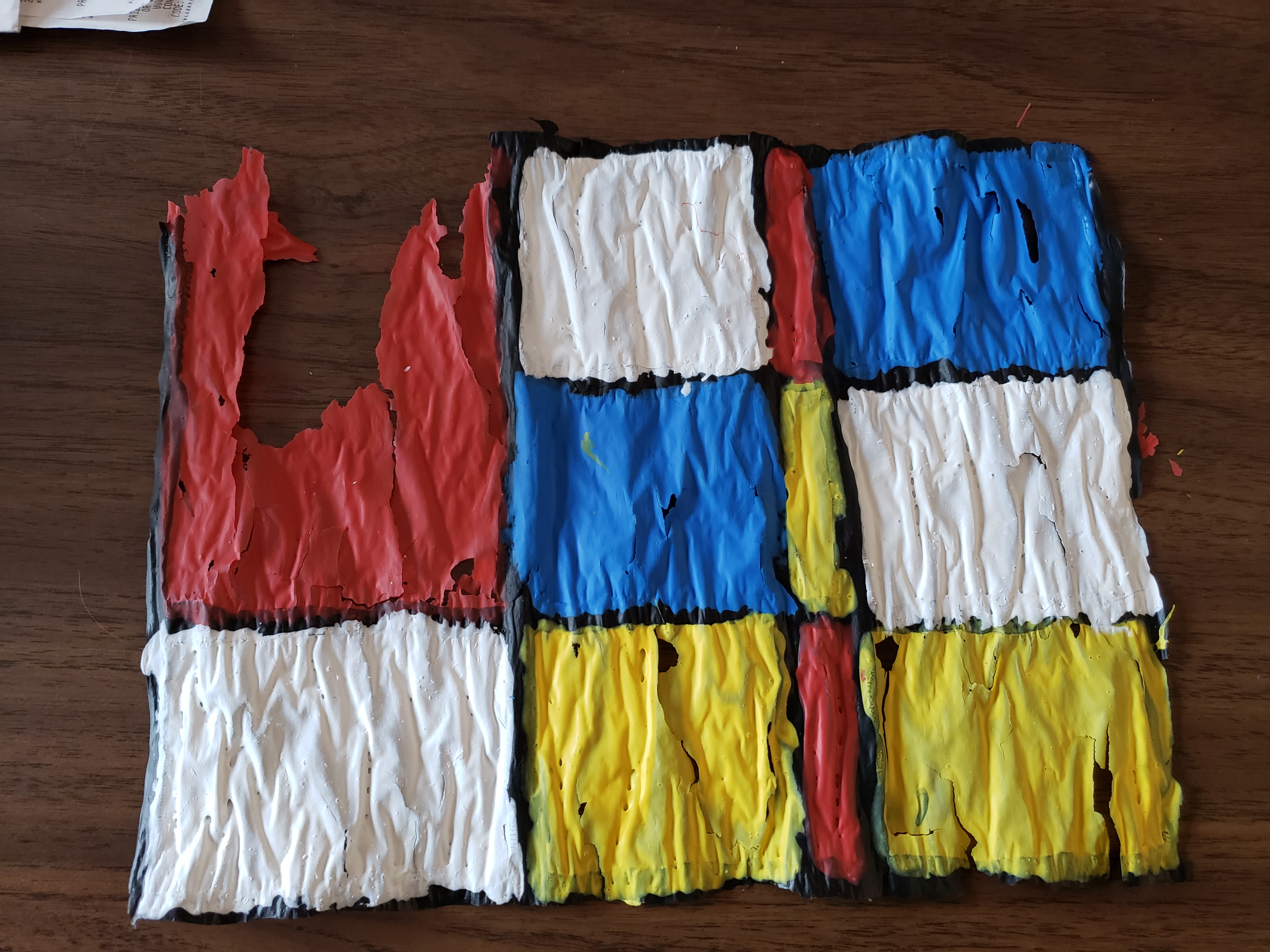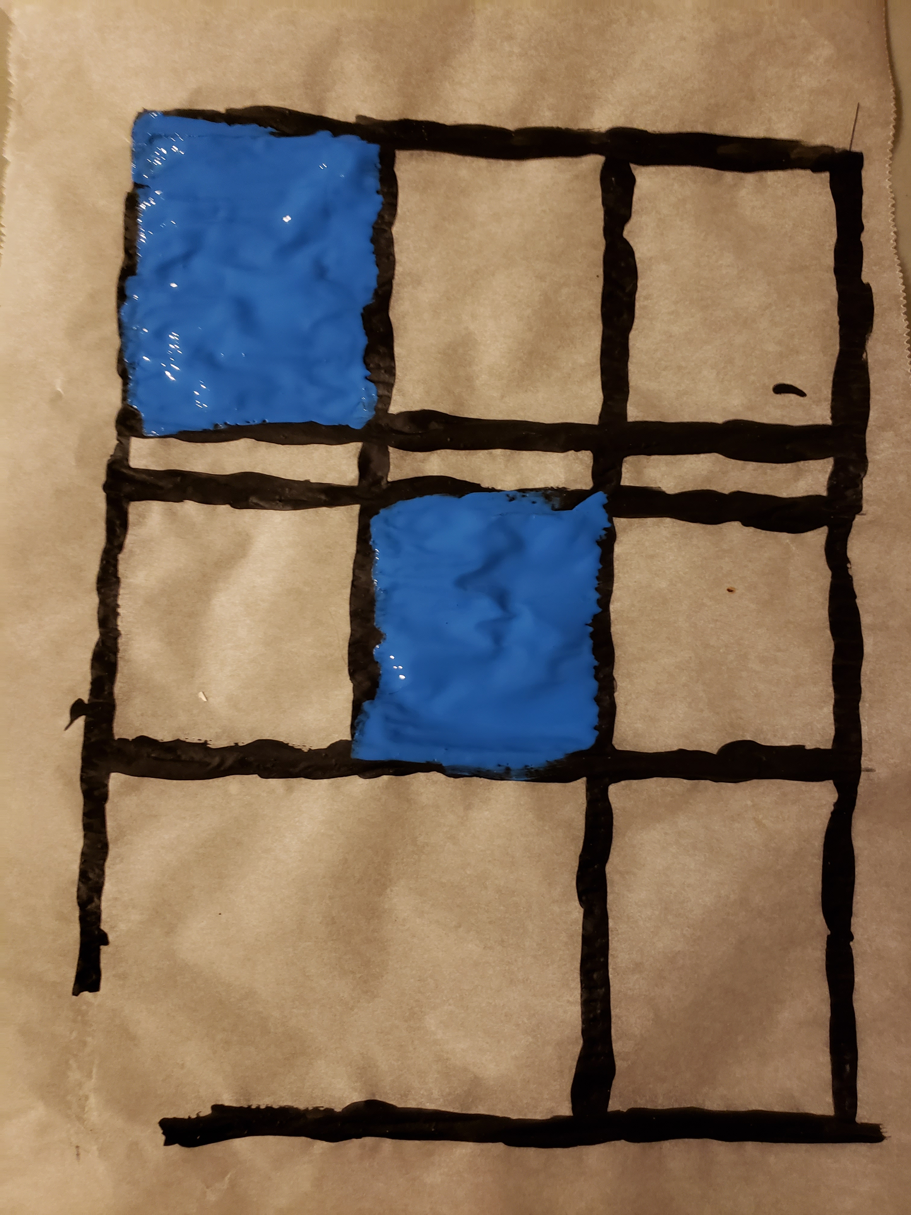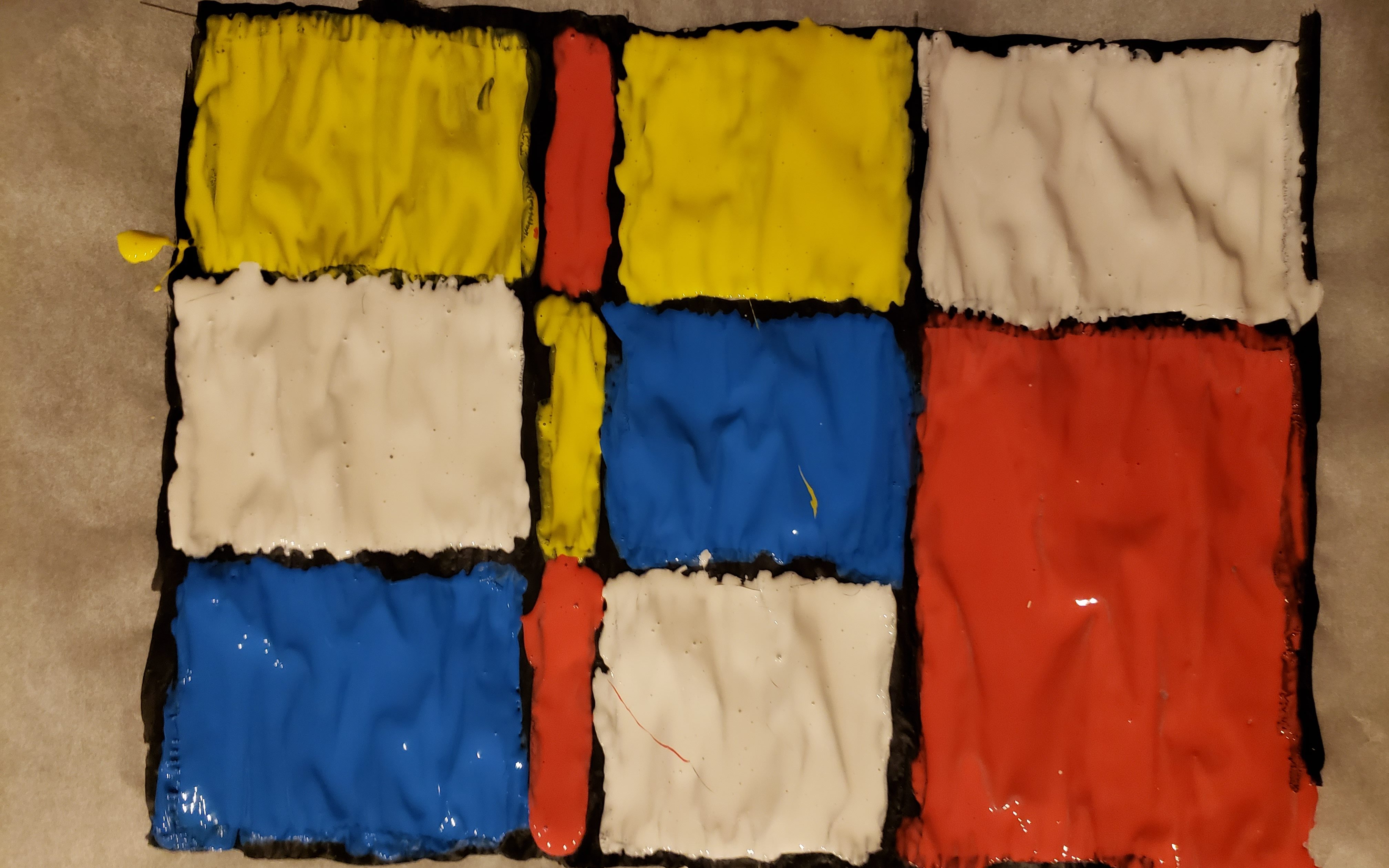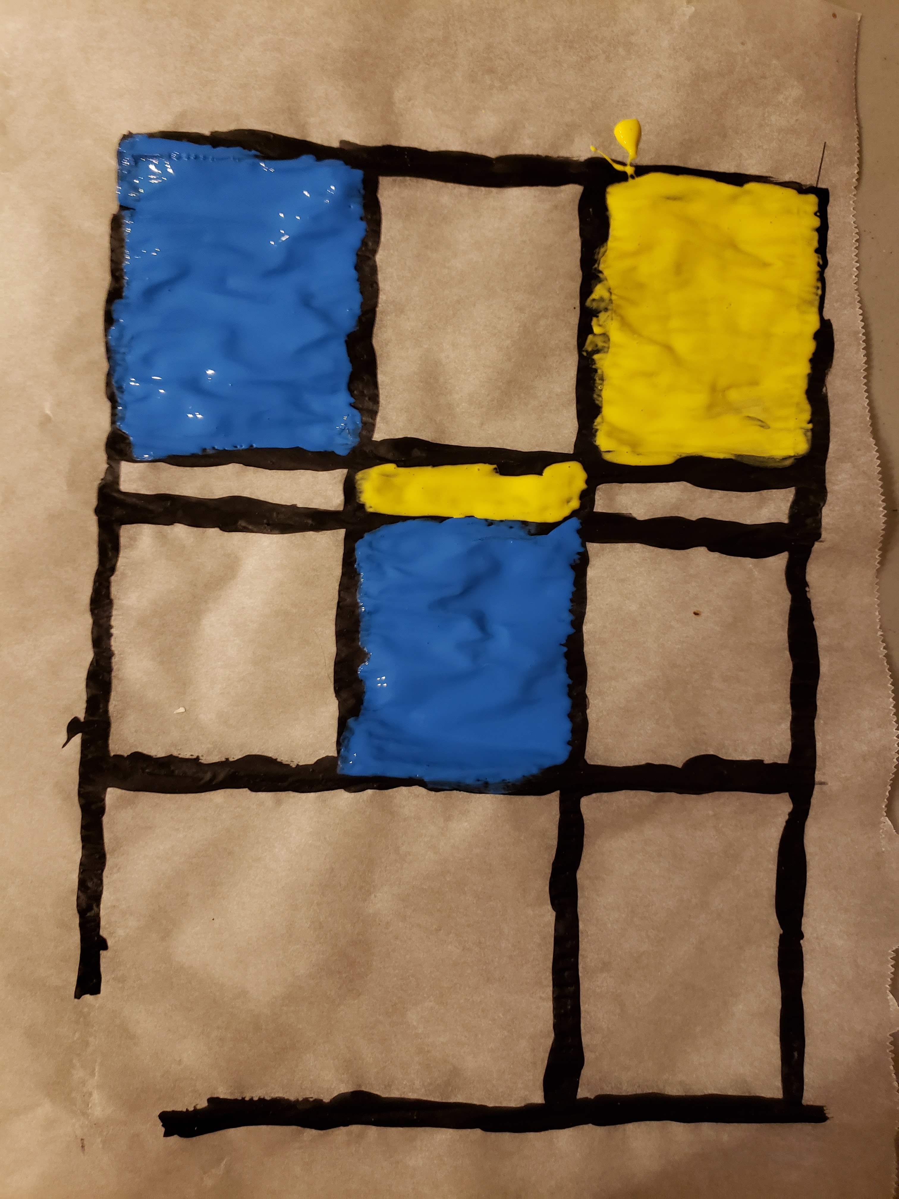 Once dry paint each square a different colour. Mondrian only used primary colours so the window paint you mix should be red, yellow, blue, white and black. Making sure to paint a little on the black edges so there are no holes in your sun catcher. (I lost a bit of the edge as I had to move tables so be careful if moving and make sure you use a thick layer for the black outline)