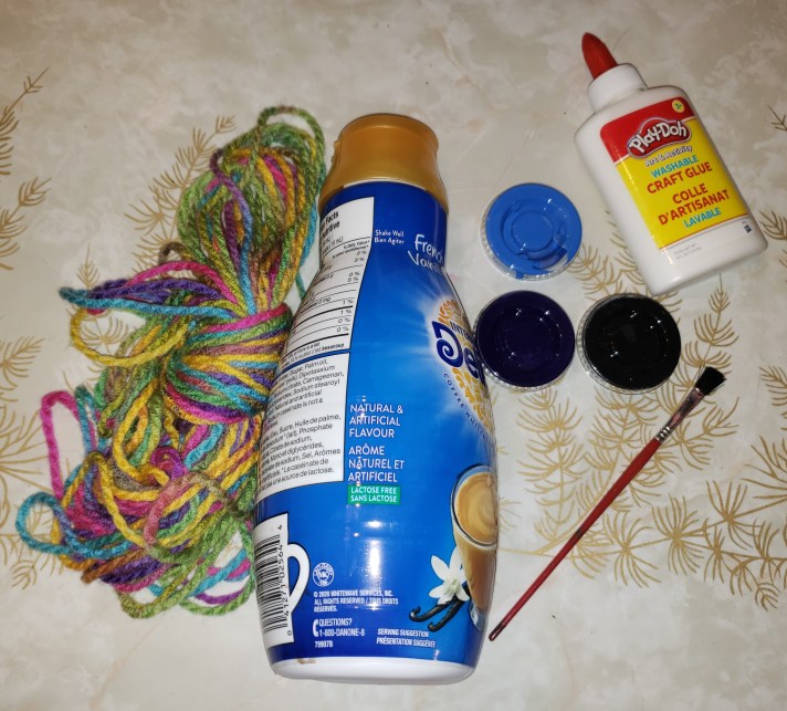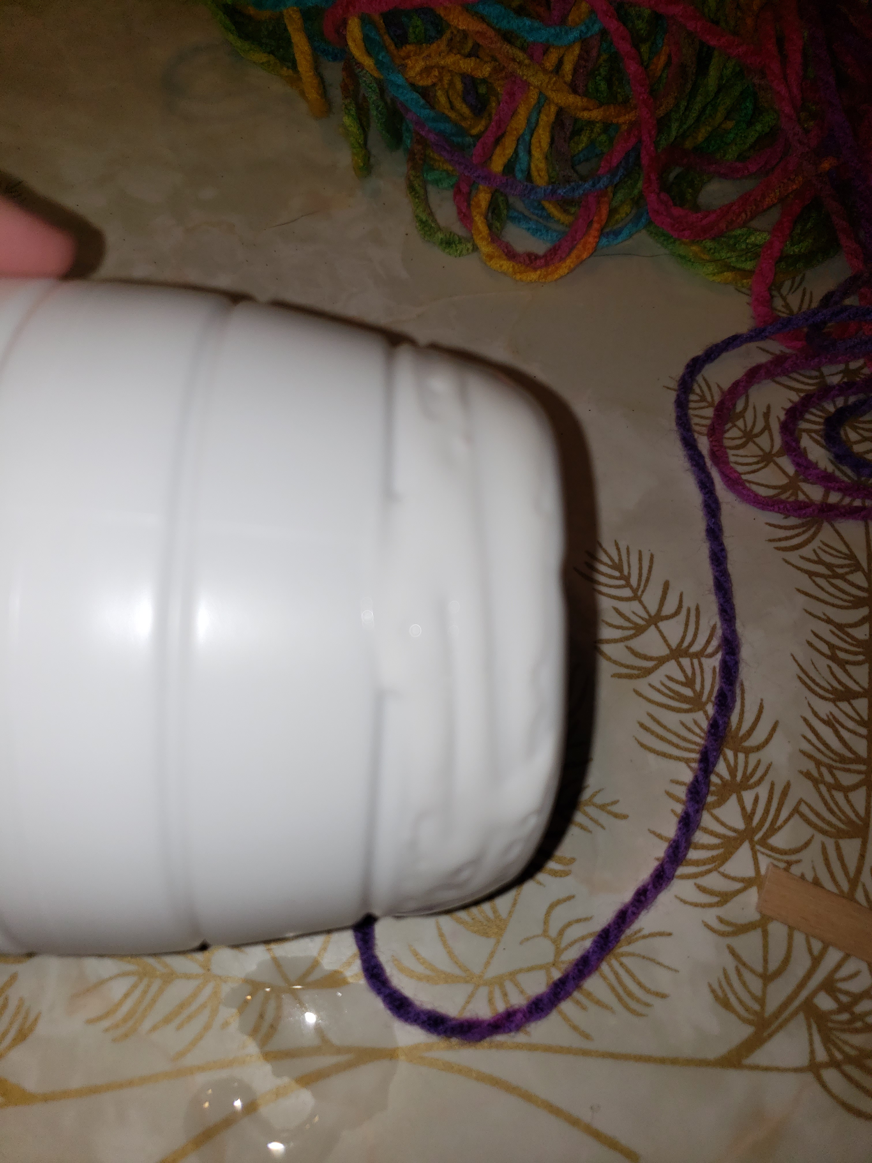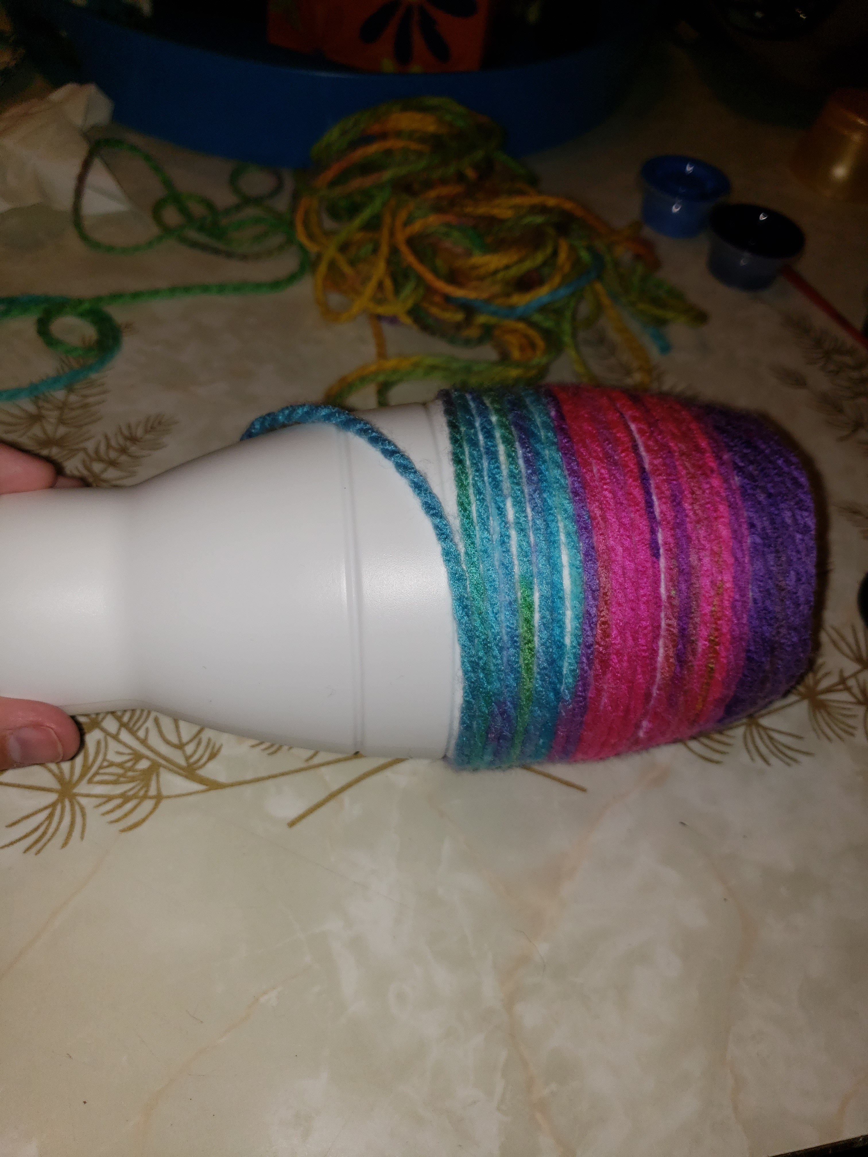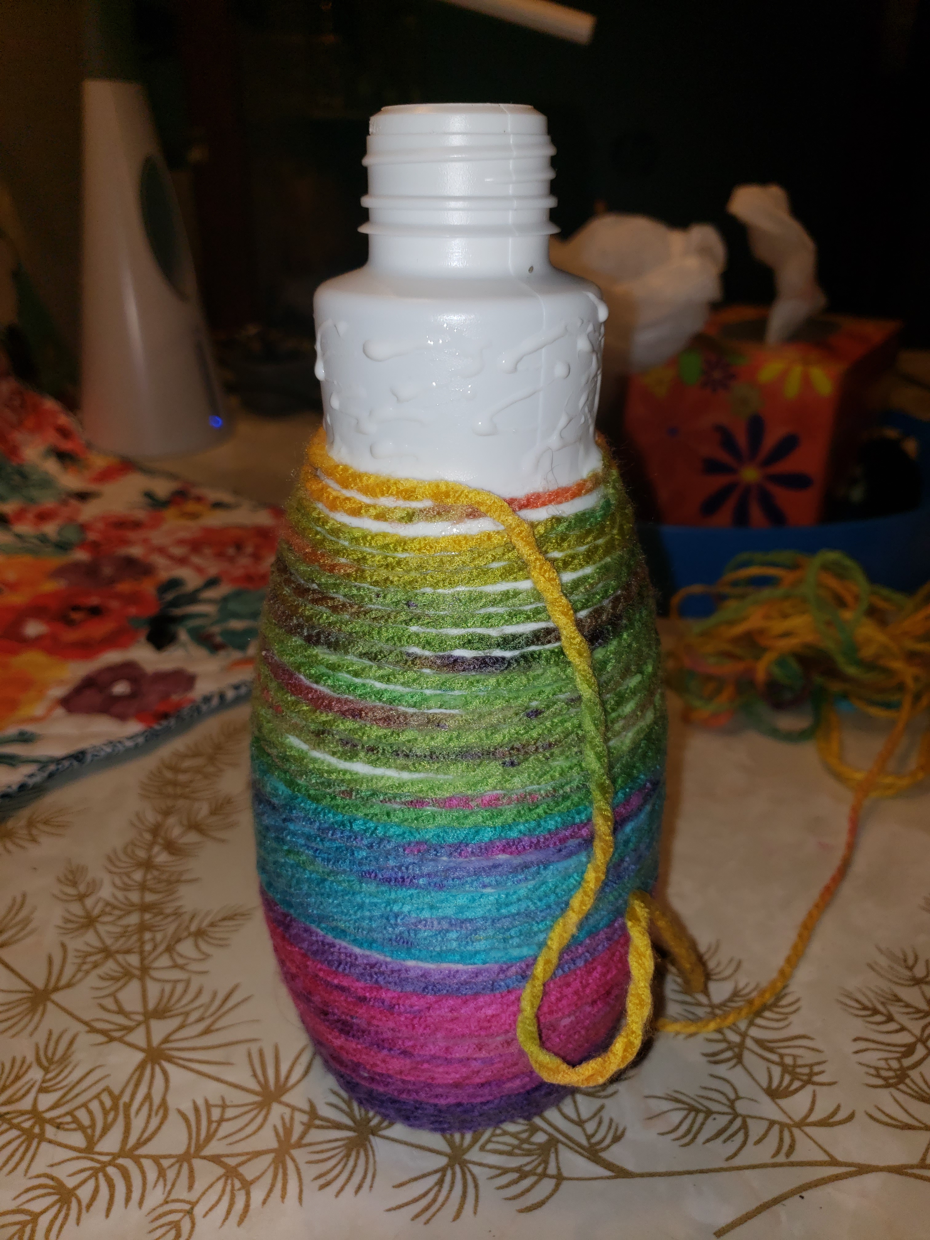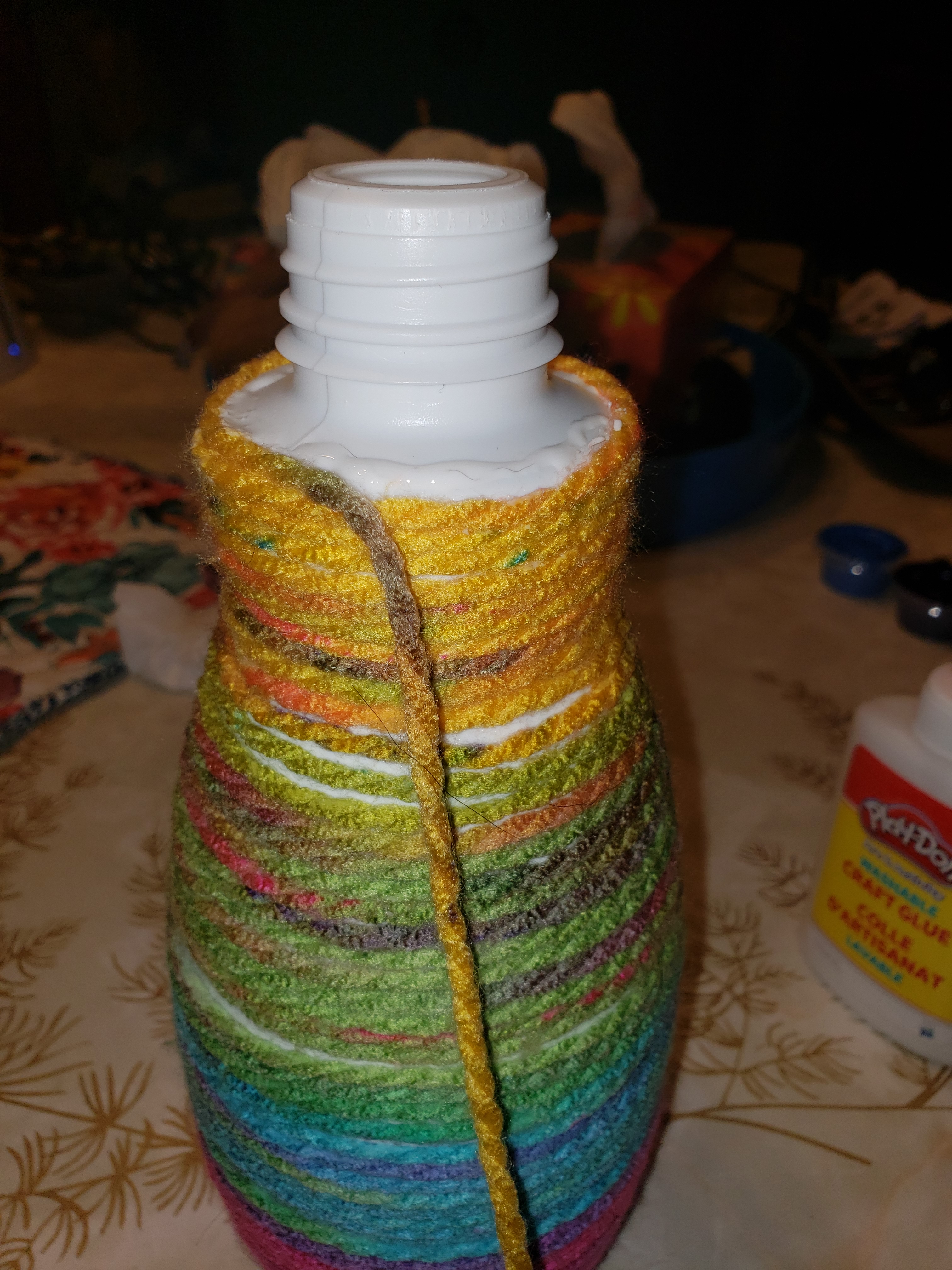 Add Glue to one section of the bottle starting at the bottom. Glue all the way around the bottle. Glue the yarn around the bottle wrapping it as close and as tight as you can. You should not see any white of the bottle.