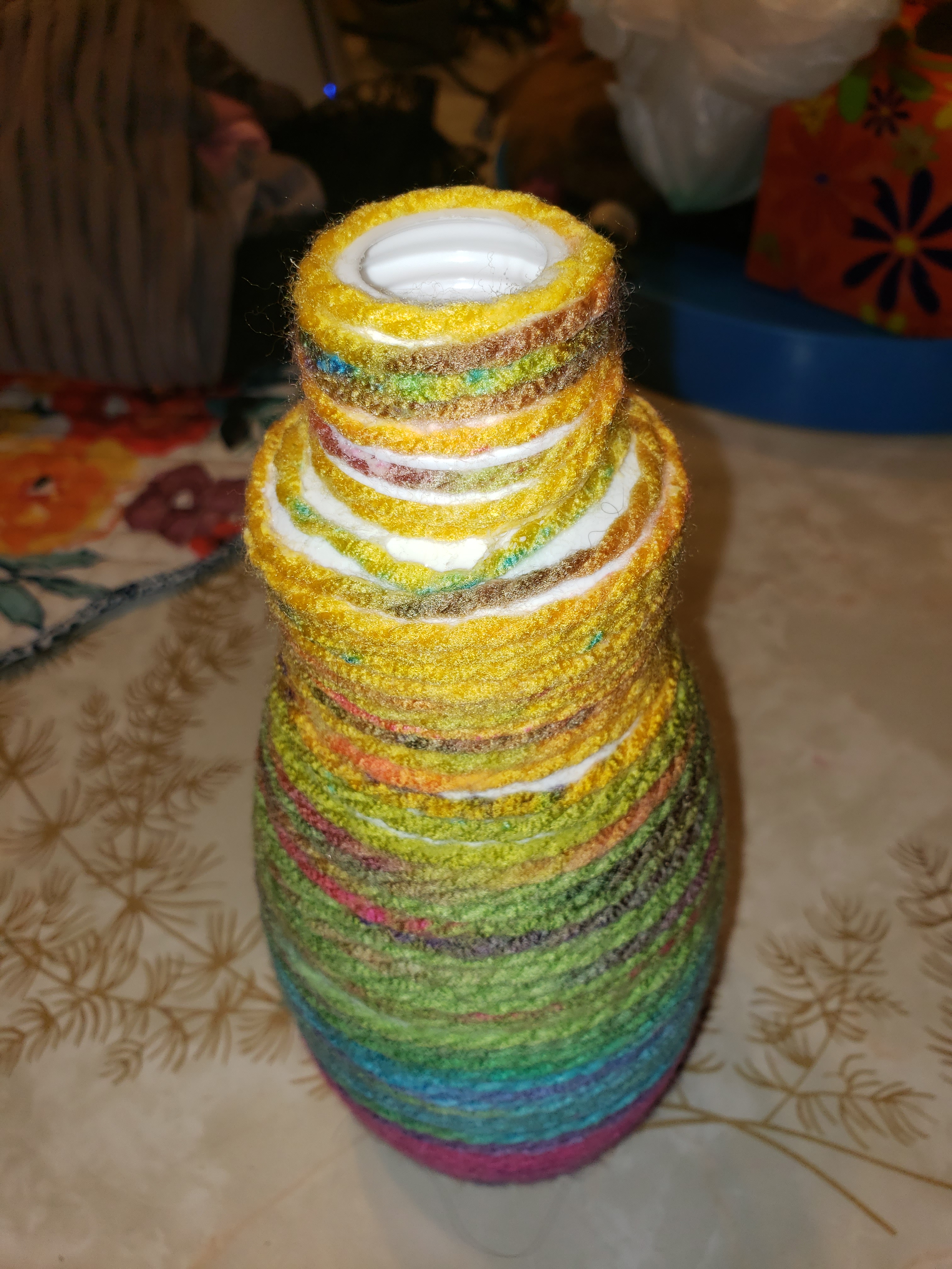Option — pick up some stones and place inside the yarn wrapped bottle to help weigh it down.