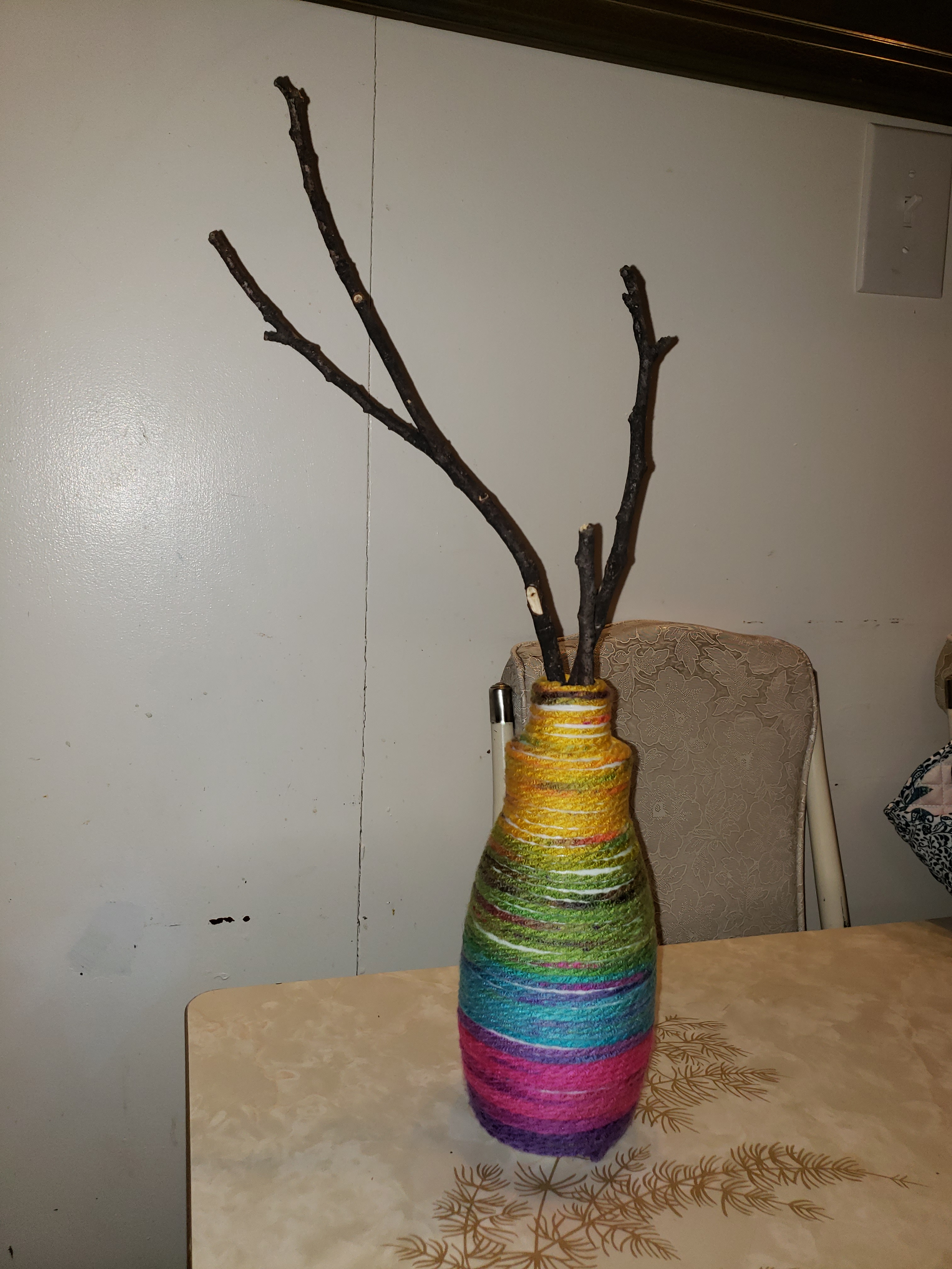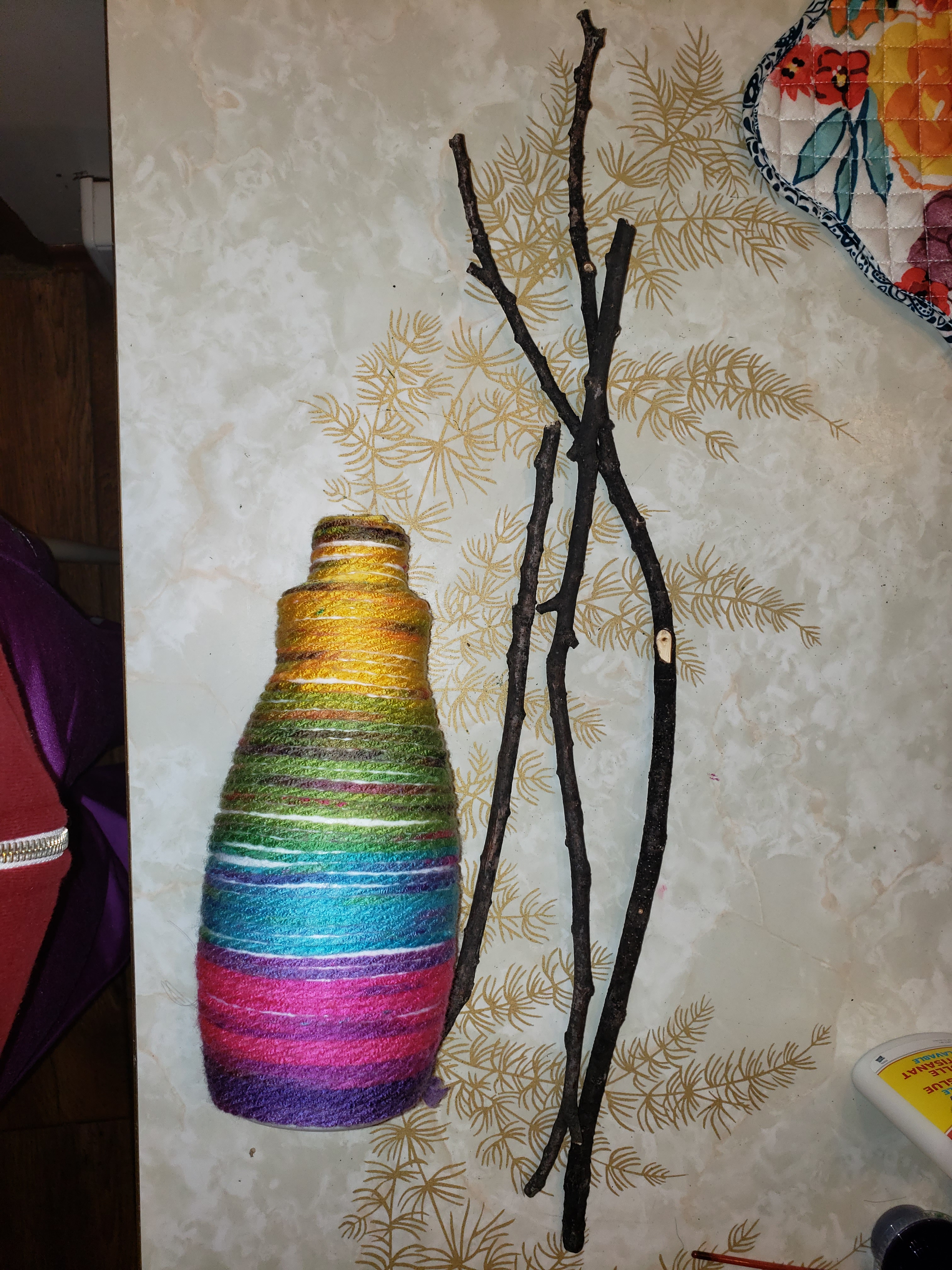 Put your sticks in the bottle then paint then bright colours. Alternatively you can glue the left over yarn around the sticks just as you did the bottle.