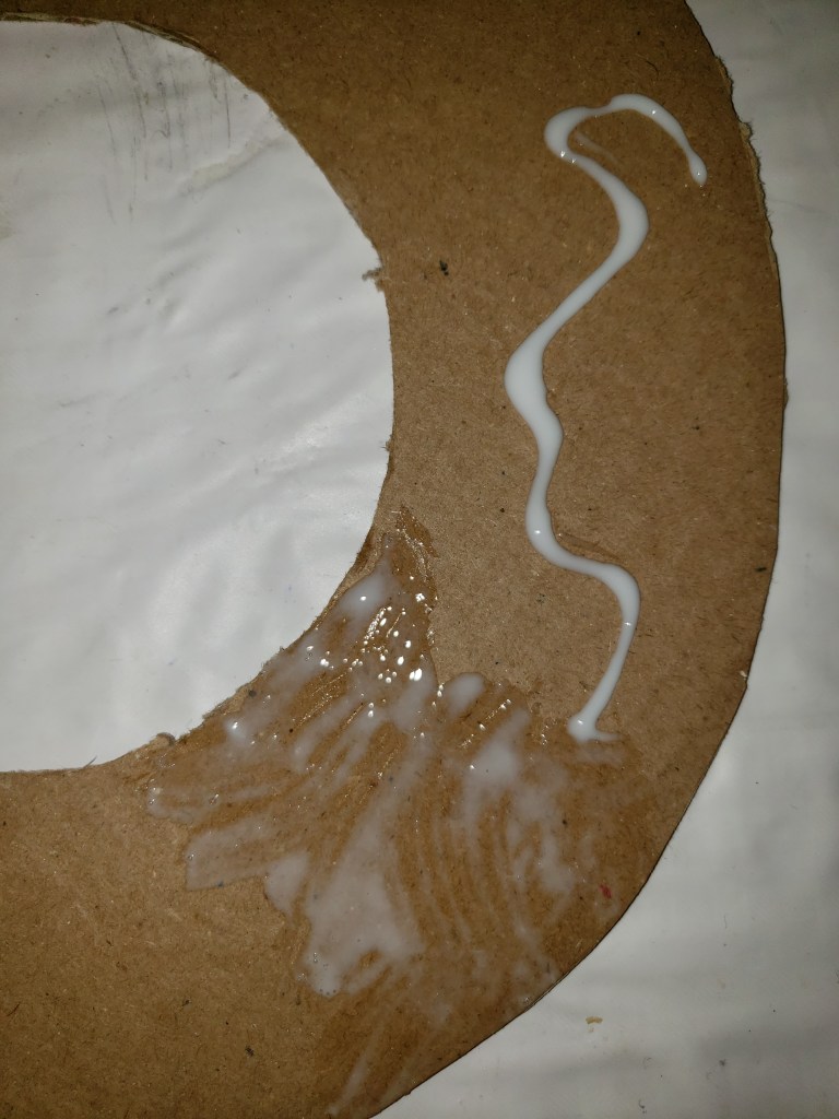 You will need to cut out a carboard circle from either one of the may delivery boxes we all get nowadays or even a cereal box can work. Then cut out the centre of your circle. Traced two bowls(one large then one small for the centre) in order to get our circles the right size. The size of your wreath depends on the size of your box but generally they are about 12inches across.