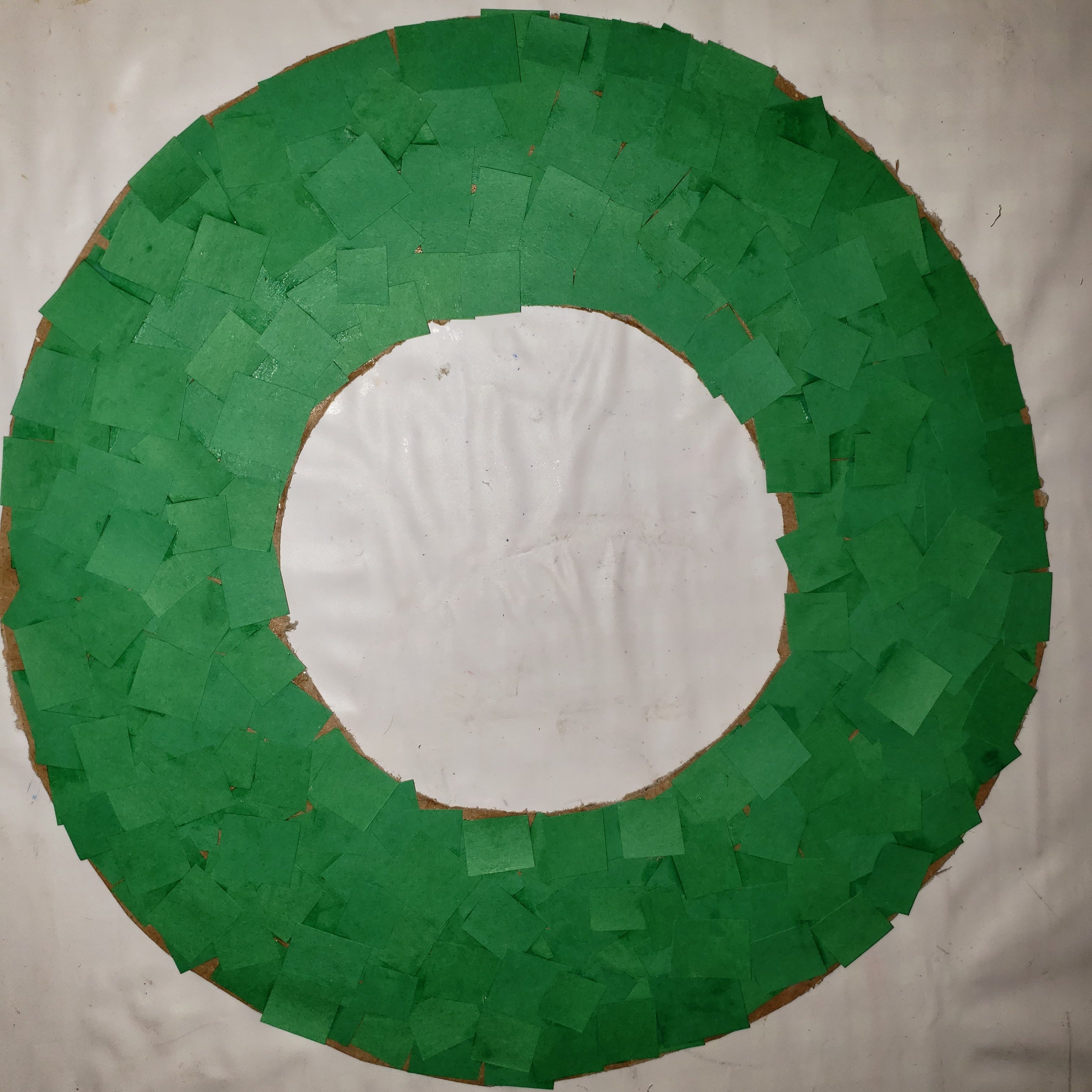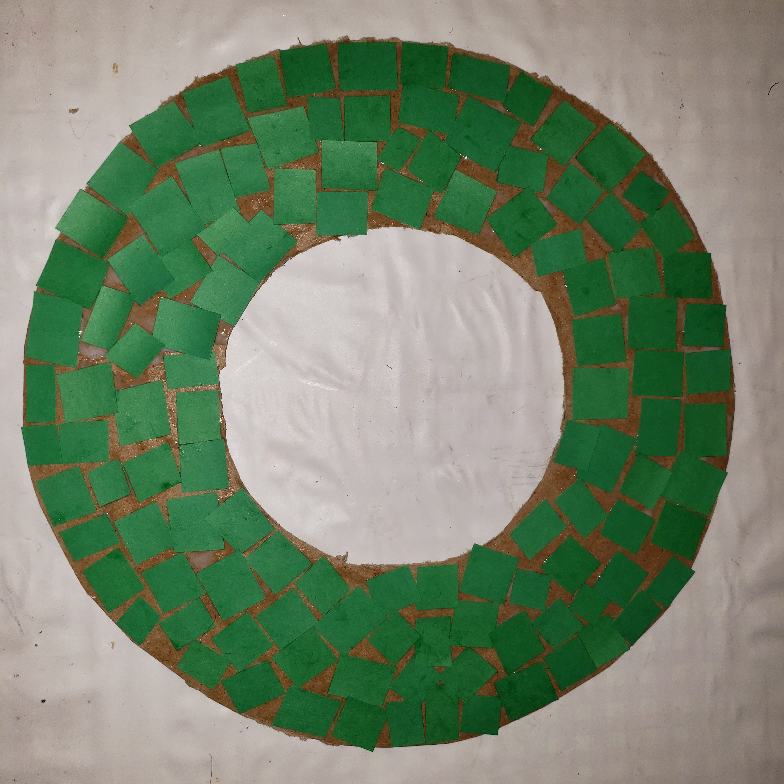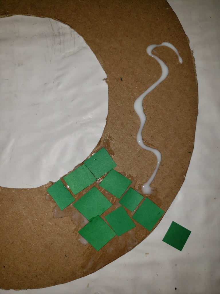 Note: If you are using paint, then instead of the paper squares just paint your carboard circle till its the shade of green you like. Let it dry before completing the next step.
