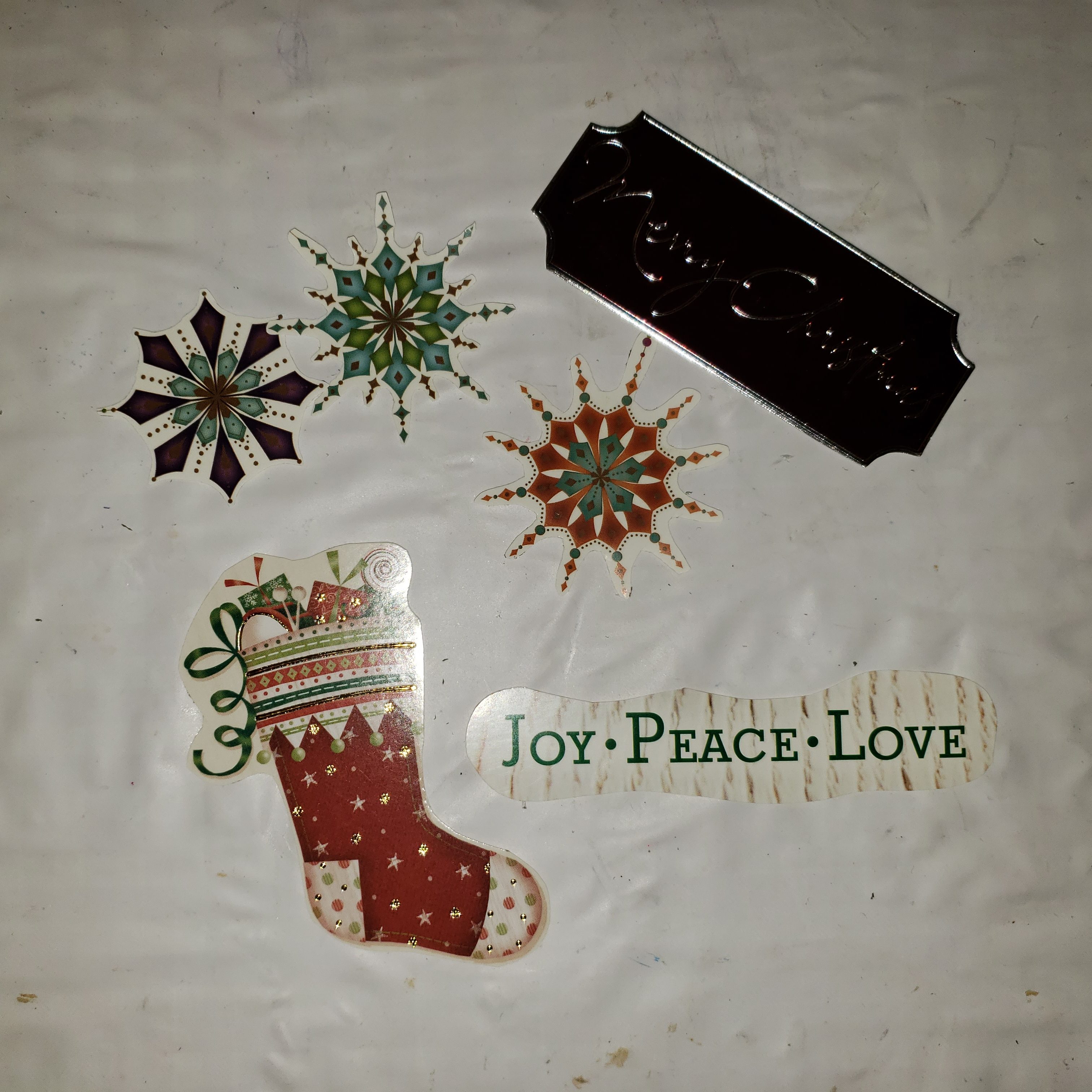 Why things are drying or setting, cut out shapes, like snowmen or Santas or phrases like “Merry Christmas” from your old Christmas Cards or wrapping paper. Printing specific shapes or graphics from the internet is also acceptable if you don’t have extra cards on hand, Christmas flyers work too.