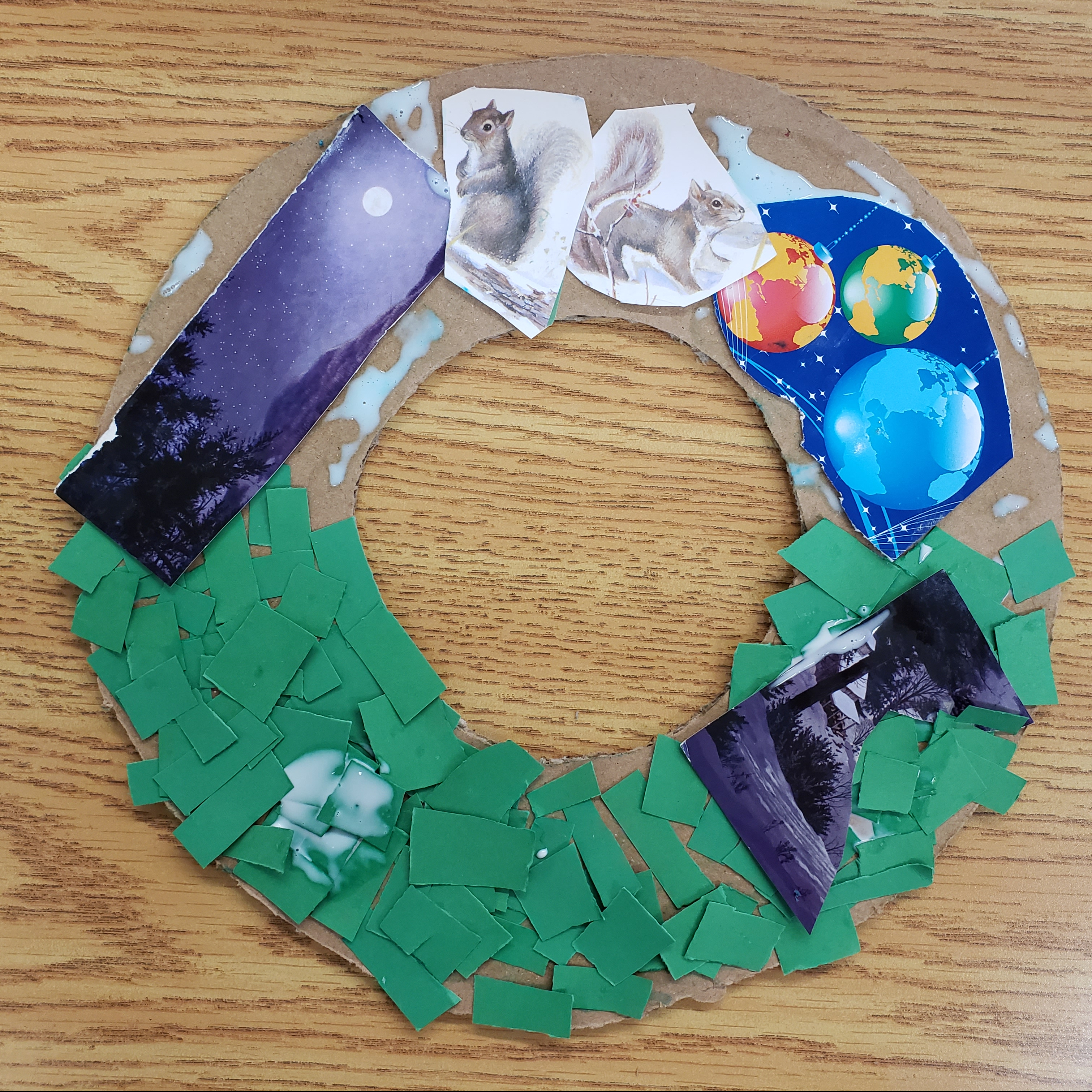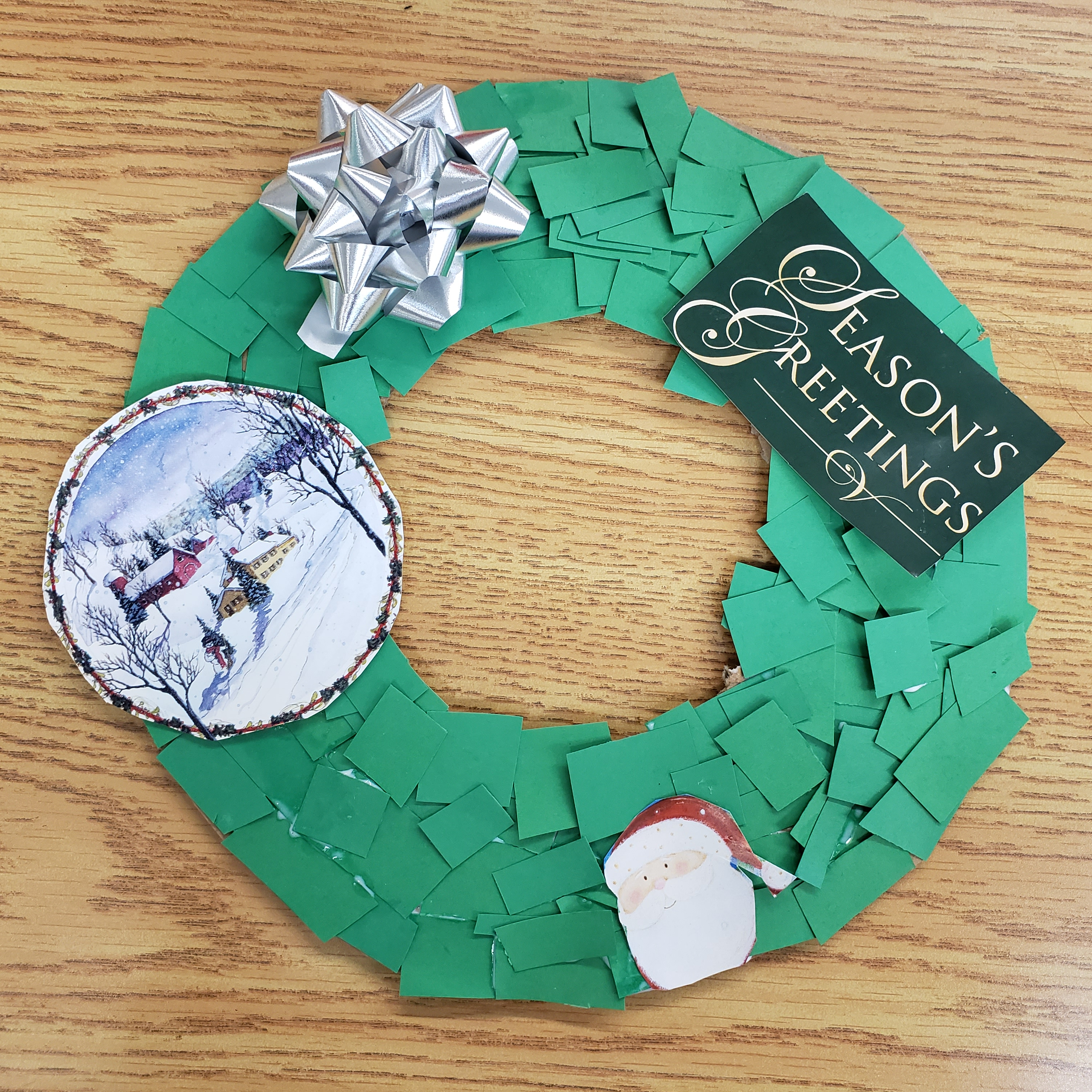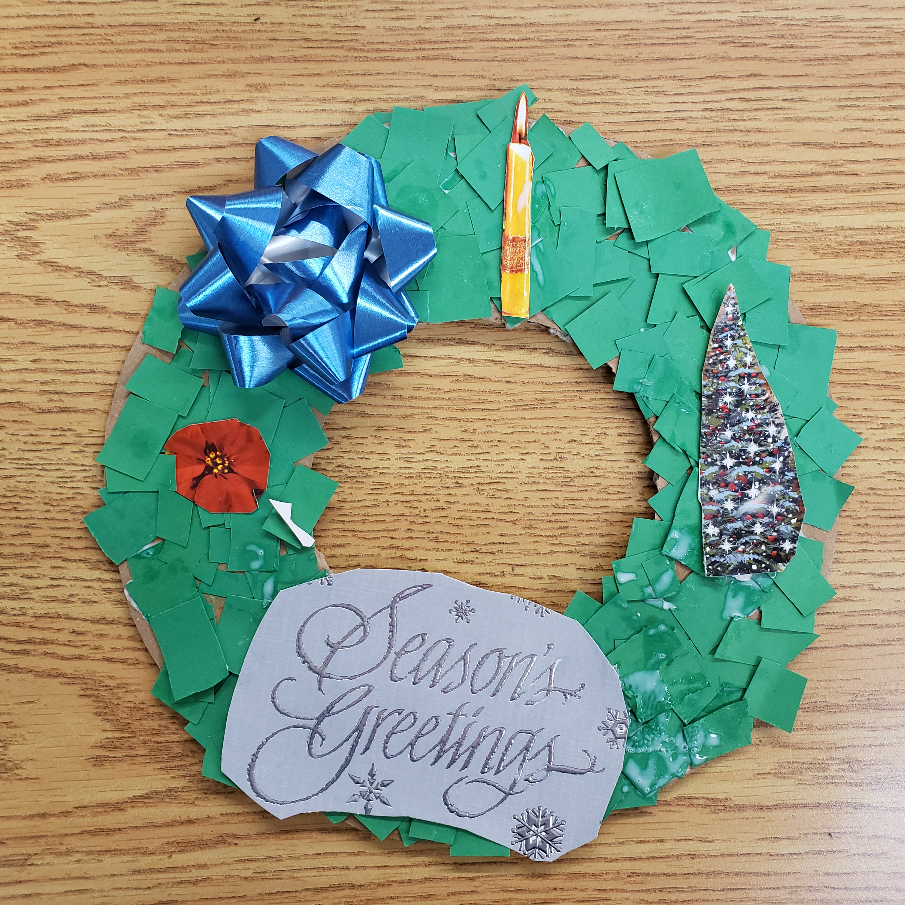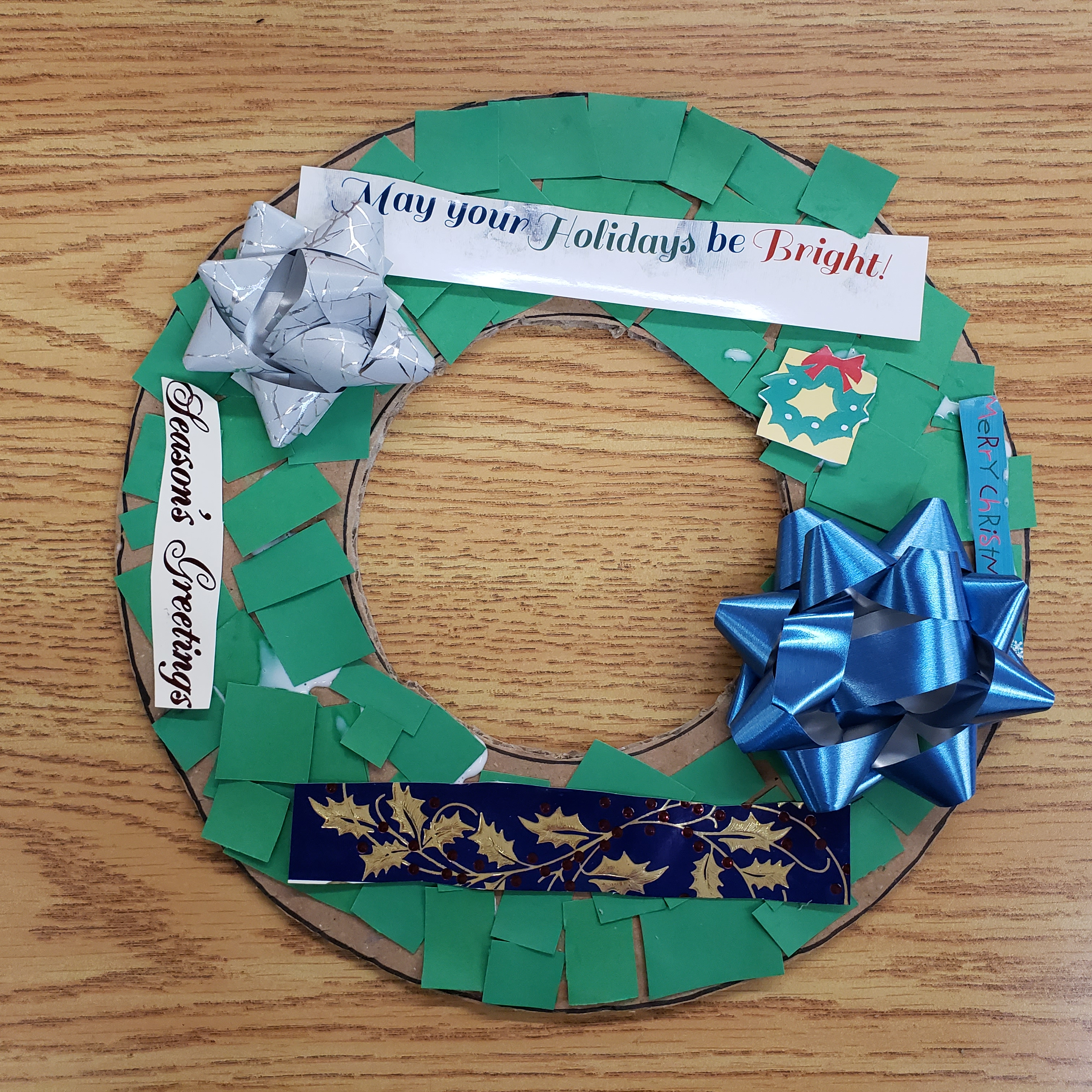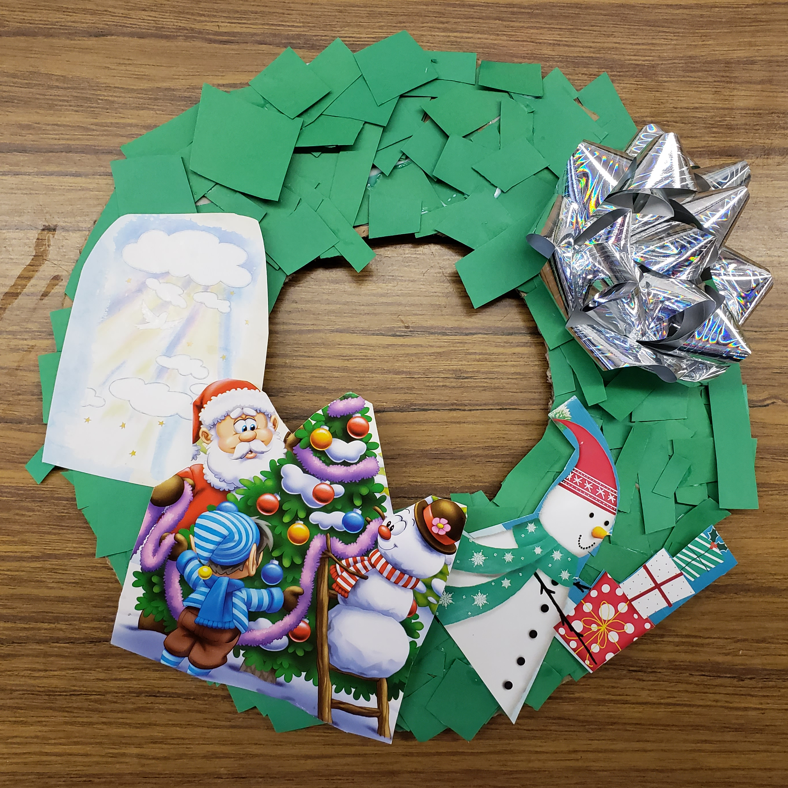 The Christmas Wreath has been around since the 16th century(probably longer). It brings holiday cheer and a welcoming feeling to your home. In fact many hang wreaths, with bells attached on their doors, which lets the homeowner know when company has come to celebrate. Over the years there has been many, many versions of this Holiday Tradition. There are big ones, little ones, ones made of evergreen trees, or cedar, ones made of fabric or tin or plastic. Some have berries, some have bows, some even have birds or candy. Usually they are green and red but really they can be all the different colours of the rainbow. The only way our wreath differs from all these other ones is that ours can be made from left over recycled material found around your house. Upcycled crafts are a favourite of our programs because it help us to keep our costs down and helps to keep items out of the landfill. All you will need is a cardboard box, some construction paper or even paint, and left over Christmas cards, wrapping paper and bows. To be honest this isn’t just a Christmas craft you could make one for each season but because its the holiday season we shall focus on Christmas and because out of all the donated items we receive to make crafts with Christmas Cards and wrapping paper seem to be the one thing we get in abundance.