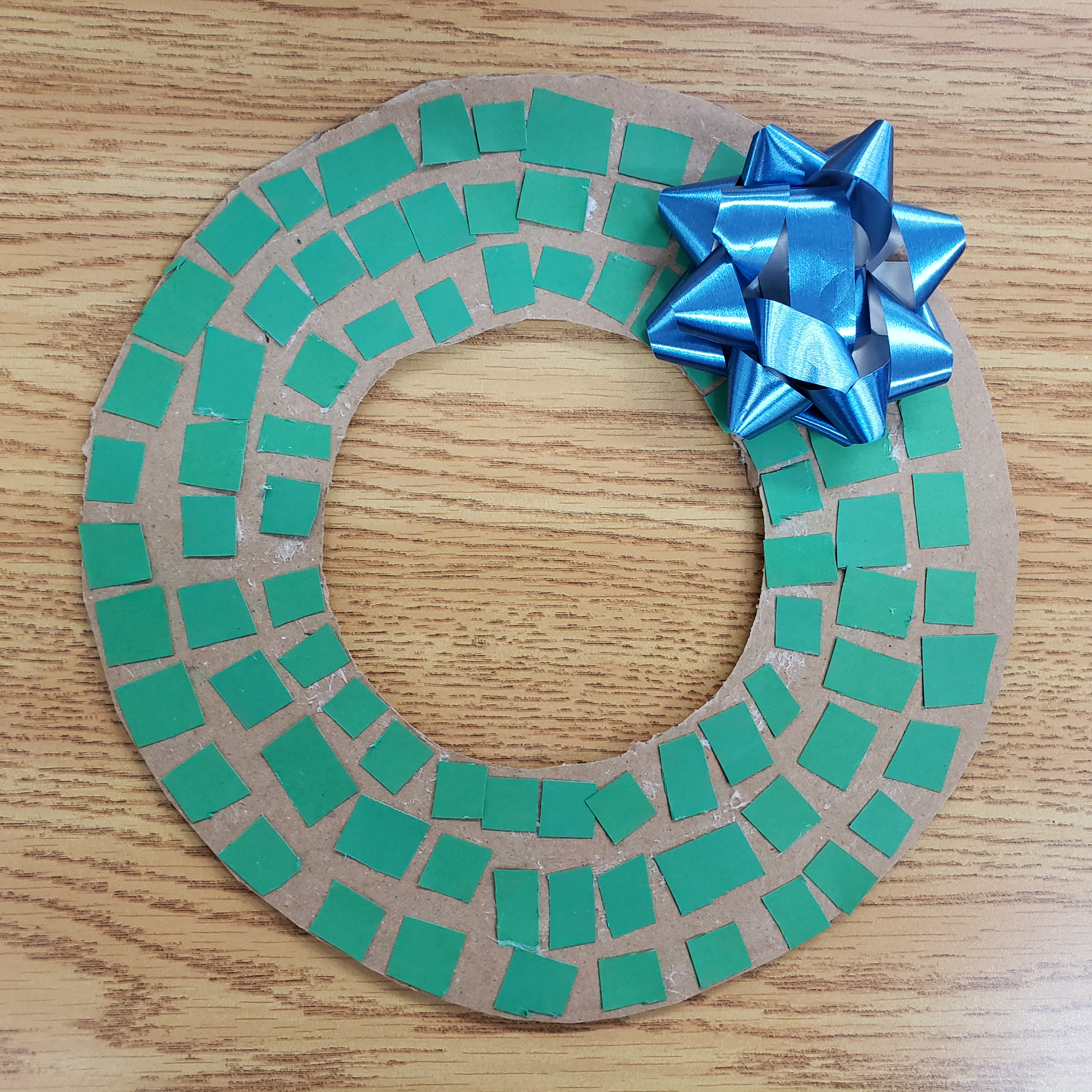 Once your circle is complete you will cut your coloured paper into strips then into squares so the wreath has a mosaic look. We choose green as we are making a more traditional wreath but you can choose whatever colour or colours for the base of your wreath. This is actually a great way to us up all those small bits of paper you might have laying around.